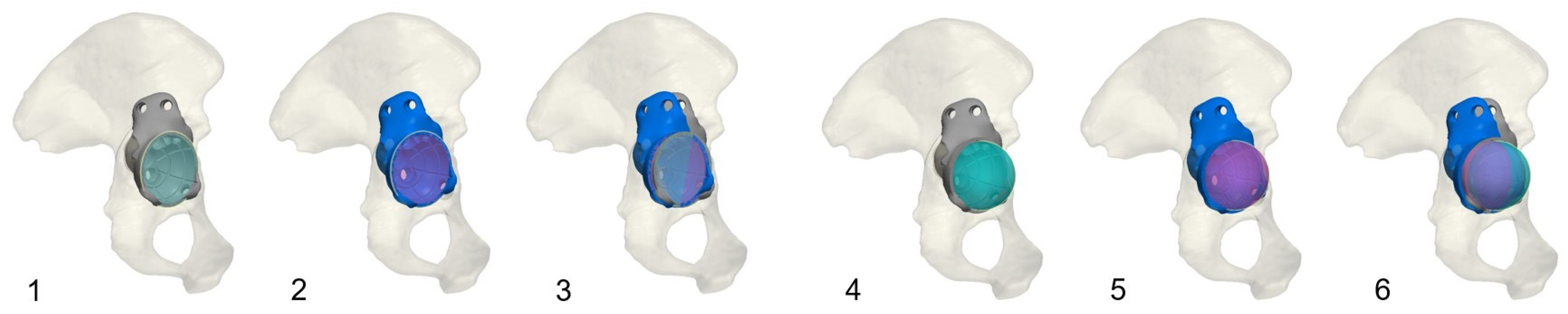 - Baauw, M.; van Hellemondt, G.G.; van Hooff, M.L.; Spruit, M. The accuracy of positioning of a custom-made implant within a large acetabular defect at revision arthroplasty of the hip. Bone Jt. J. 2015, 97, 780–785. [Google Scholar] [CrossRef] [PubMed]