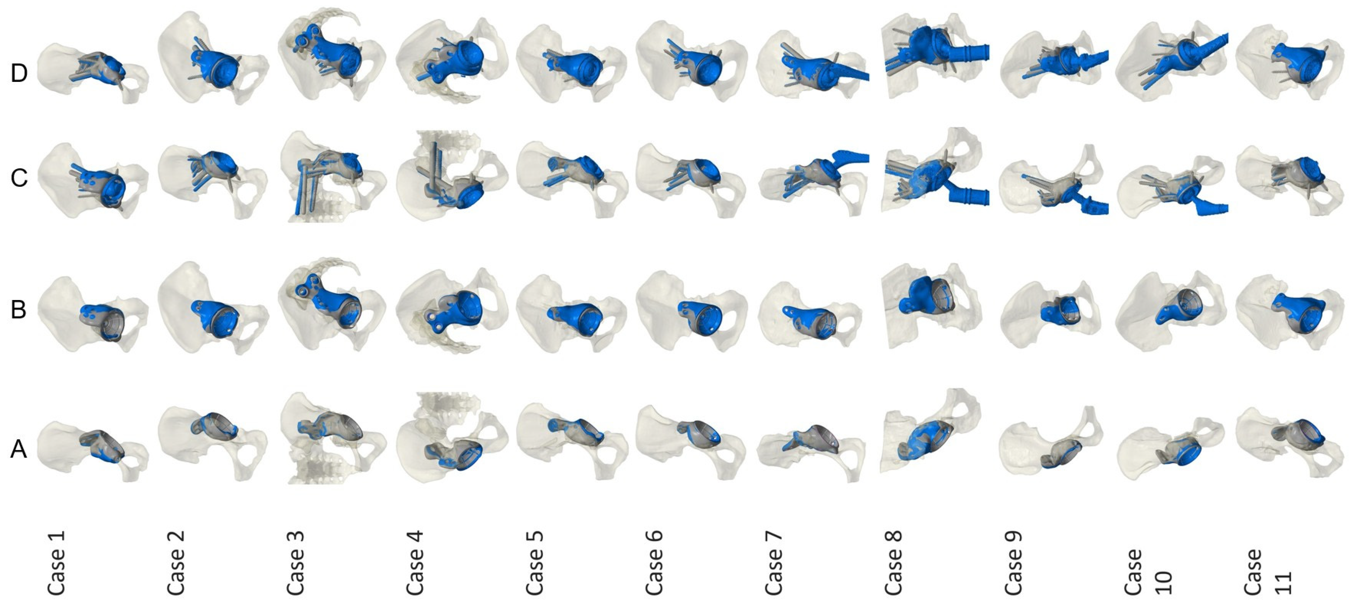 - Wessling, M.; Gebert, C.; Hakenes, T.; Dudda, M.; Hardes, J.; Frieler, S.; Jeys, L.M.; Hanusrichter, Y. Reconstruction of paprosky iii defects with custom-made implants: Do we get them in the correct position?: Short-term radiological results. Bone Jt. J. 2022, 104, 1110–1117. [Google Scholar] [CrossRef]