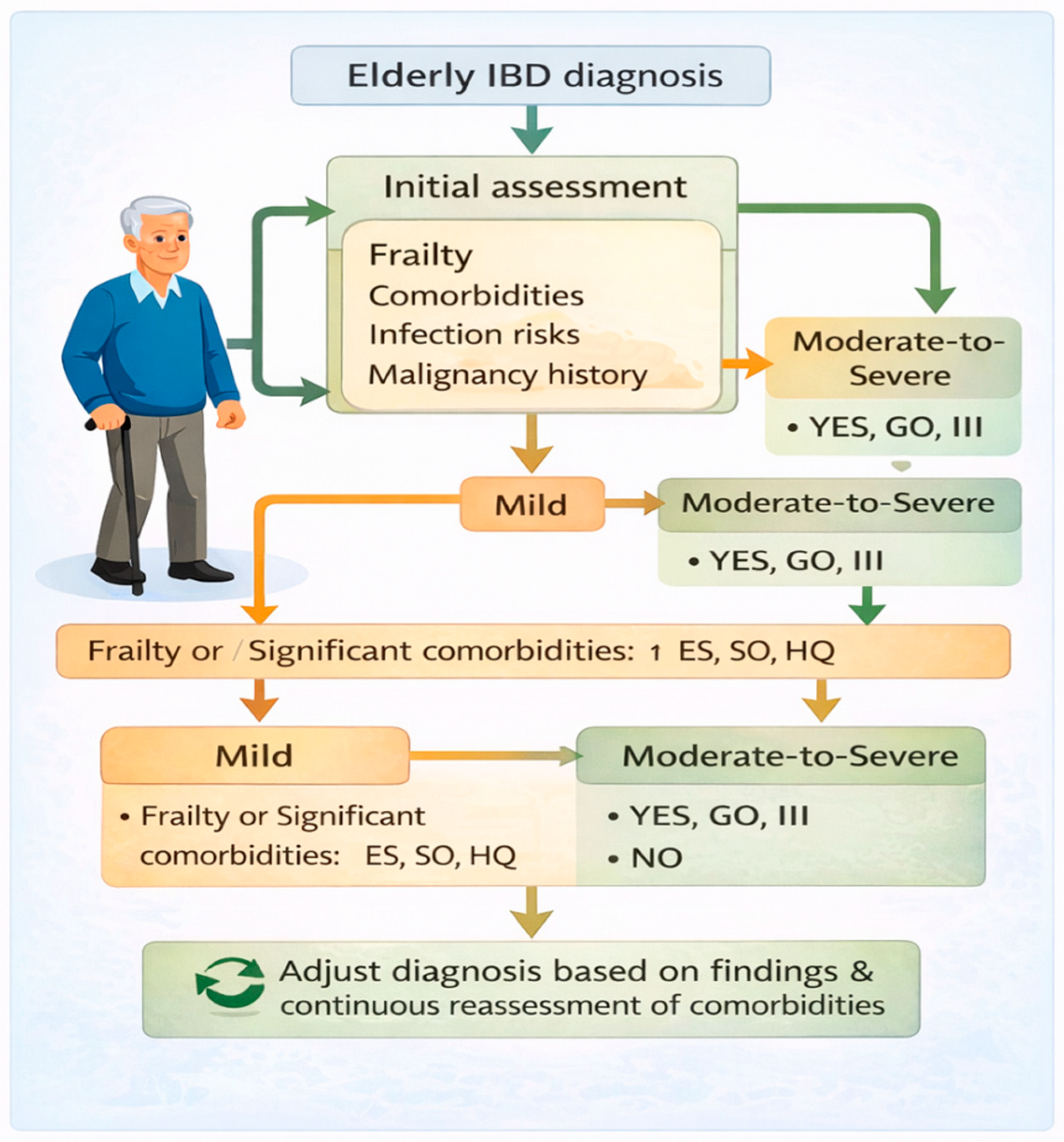 - Singh, S.; Boland, B.S.; Jess, T.; Moore, A.A. Management of inflammatory bowel diseases in older adults. Lancet Gastroenterol. Hepatol. 2023, 8, 368–382. [Google Scholar] [CrossRef] [PubMed]