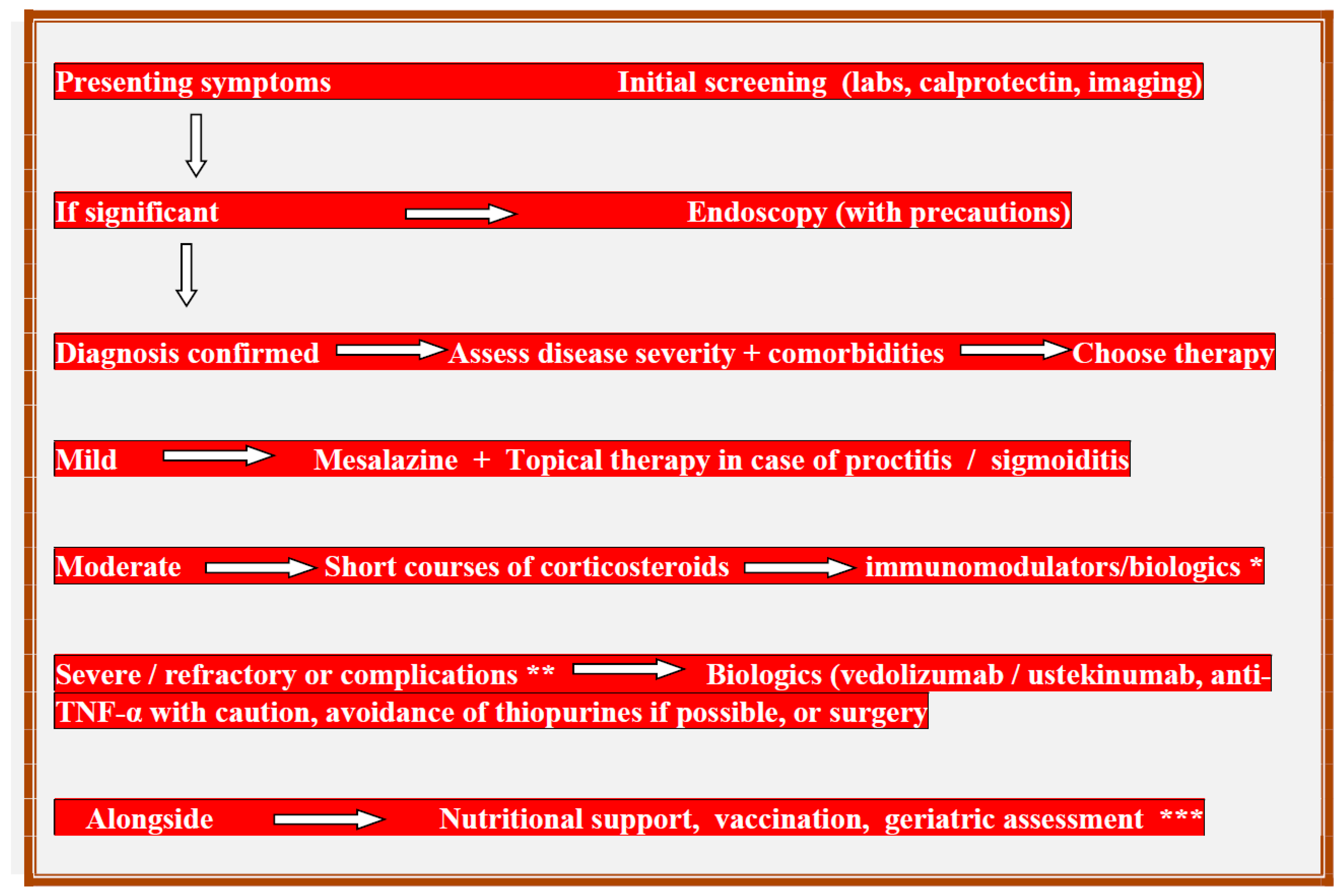 - Nutritional assessment (malnutrition and vitamin D deficiency are standard in older IBD patients).