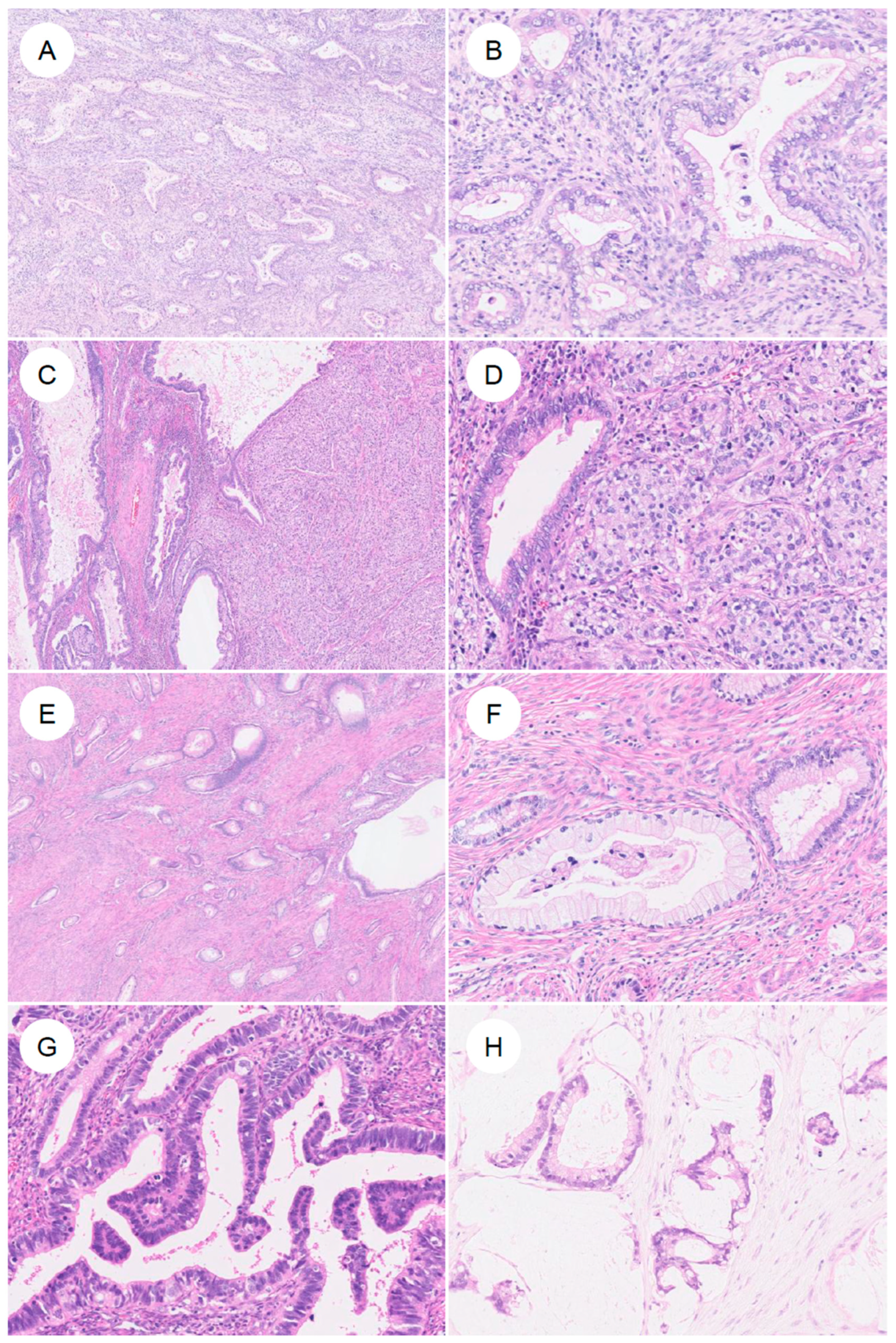 - Kawakami, F.; Yanai, H.; Teramoto, N.; Miyama, Y.; Yasuda, M.; Minamiguchi, S.; Iwamoto, M.; Kiyokawa, T.; Mikami, Y. Concordance Between Biopsy and Resection Diagnoses of Uterine Cervical Adenocarcinoma According to the Updated World Health Organization 2020 Classification: A Multi-Institutional Study Elucidating Real-World Practice in Japan. Arch. Pathol. Lab. Med. 2024, 148, 1218–1225. [Google Scholar] [CrossRef] [PubMed]