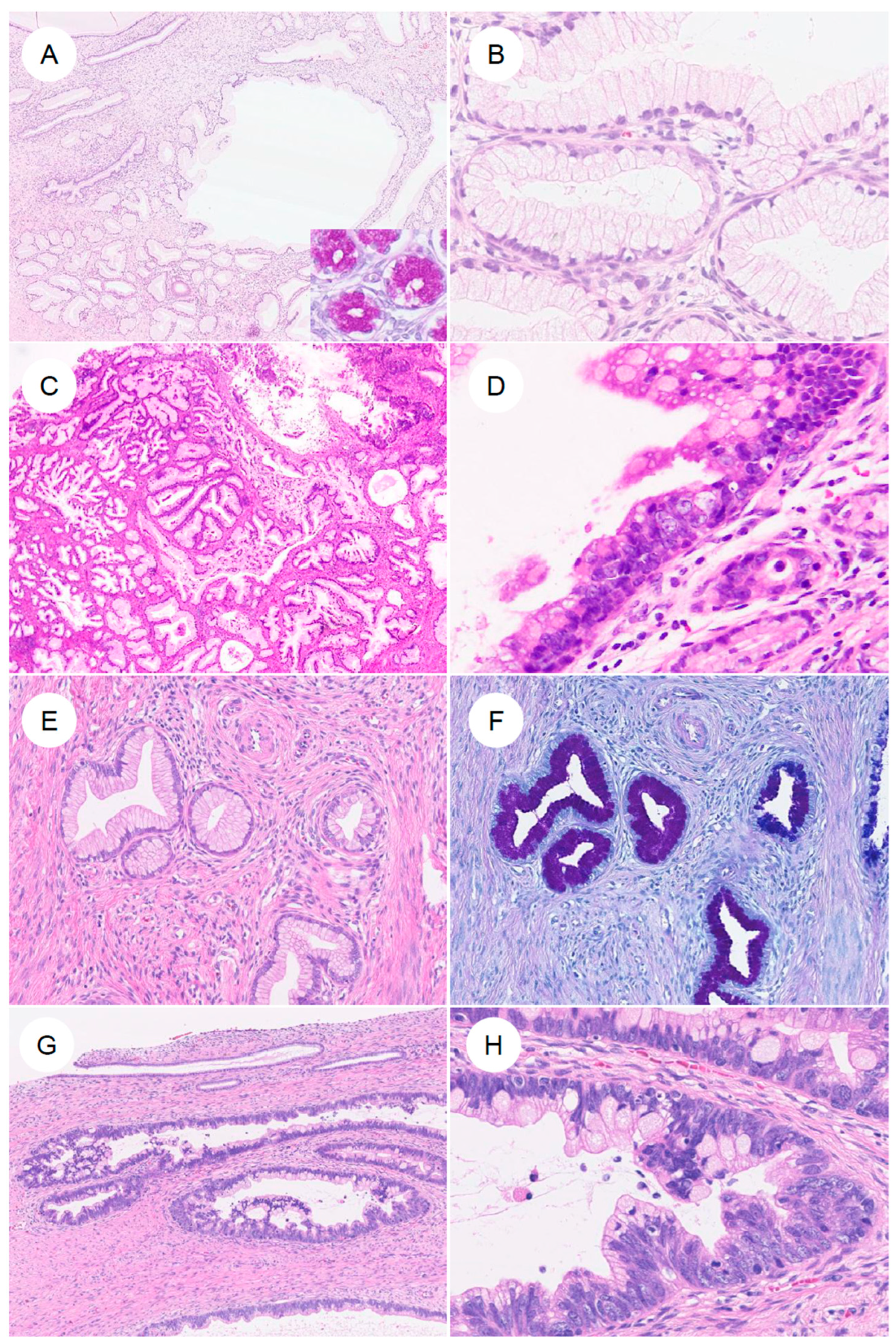 - Hayashi, I.; Tsuda, H.; Shimoda, T.; Maeshima, A.; Kasamatsu, T.; Yamada, T.; Tsunematsu, R. Difference in cytoplasmic localization pattern of neutral mucin among lobular endocervical glandular hyperplasia, adenoma malignum, and common adenocarcinoma of the uterine cervix. Virchows Arch. 2003, 443, 752–760. [Google Scholar] [CrossRef]