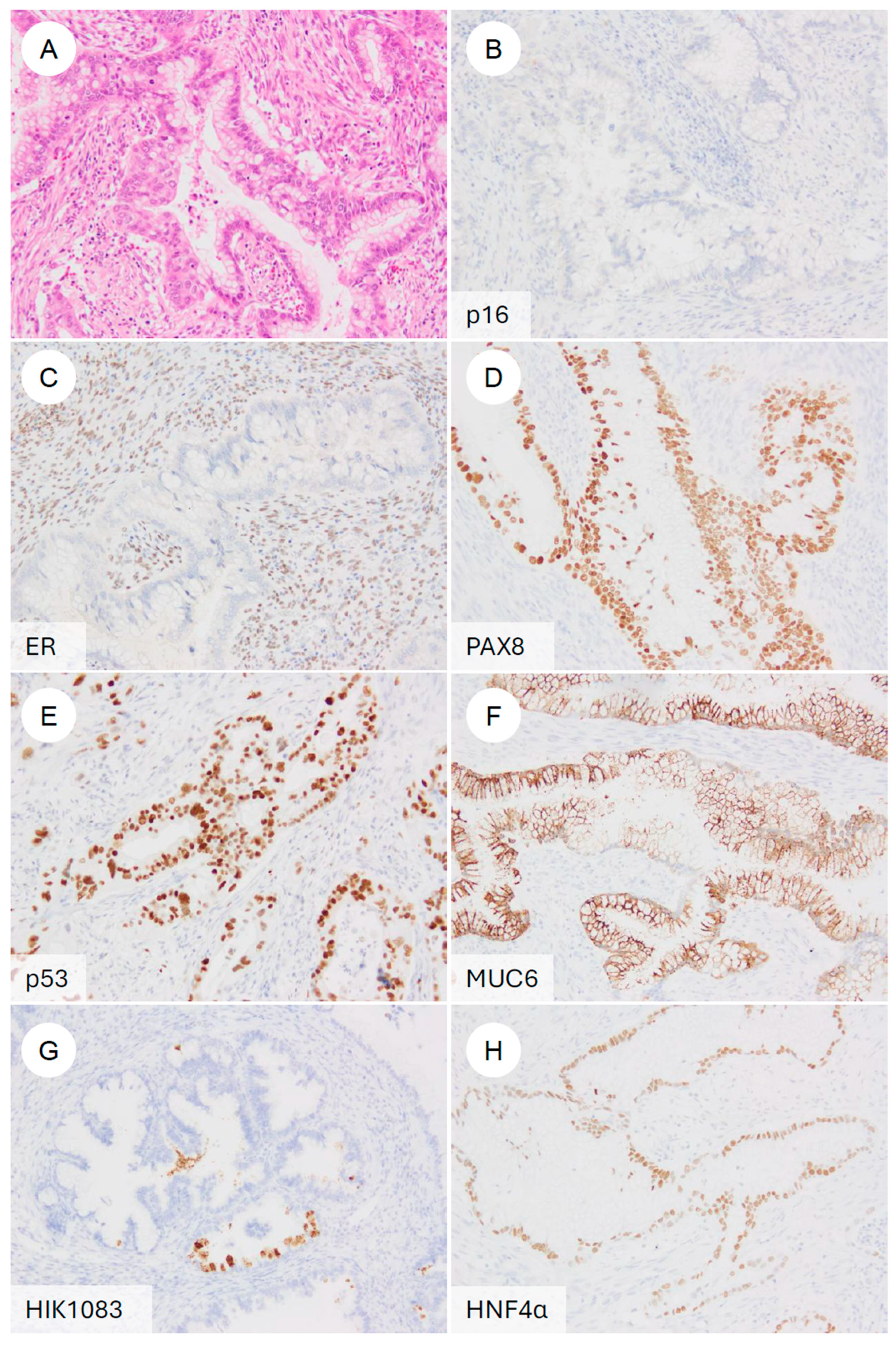 - Li, H.M.; Lei, R.X.; Yang, H.J. Clinicopathologic characteristics and outcome of gastric-type endocervical adenocarcinoma: A single-center retrospective study. Int. J. Clin. Exp. Pathol. 2025, 18, 258–266. [Google Scholar] [CrossRef] [PubMed]
