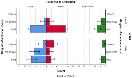 | Dry mouth | Never | 15 | 2 | 17 (34) | 2.556 | 0.279 |