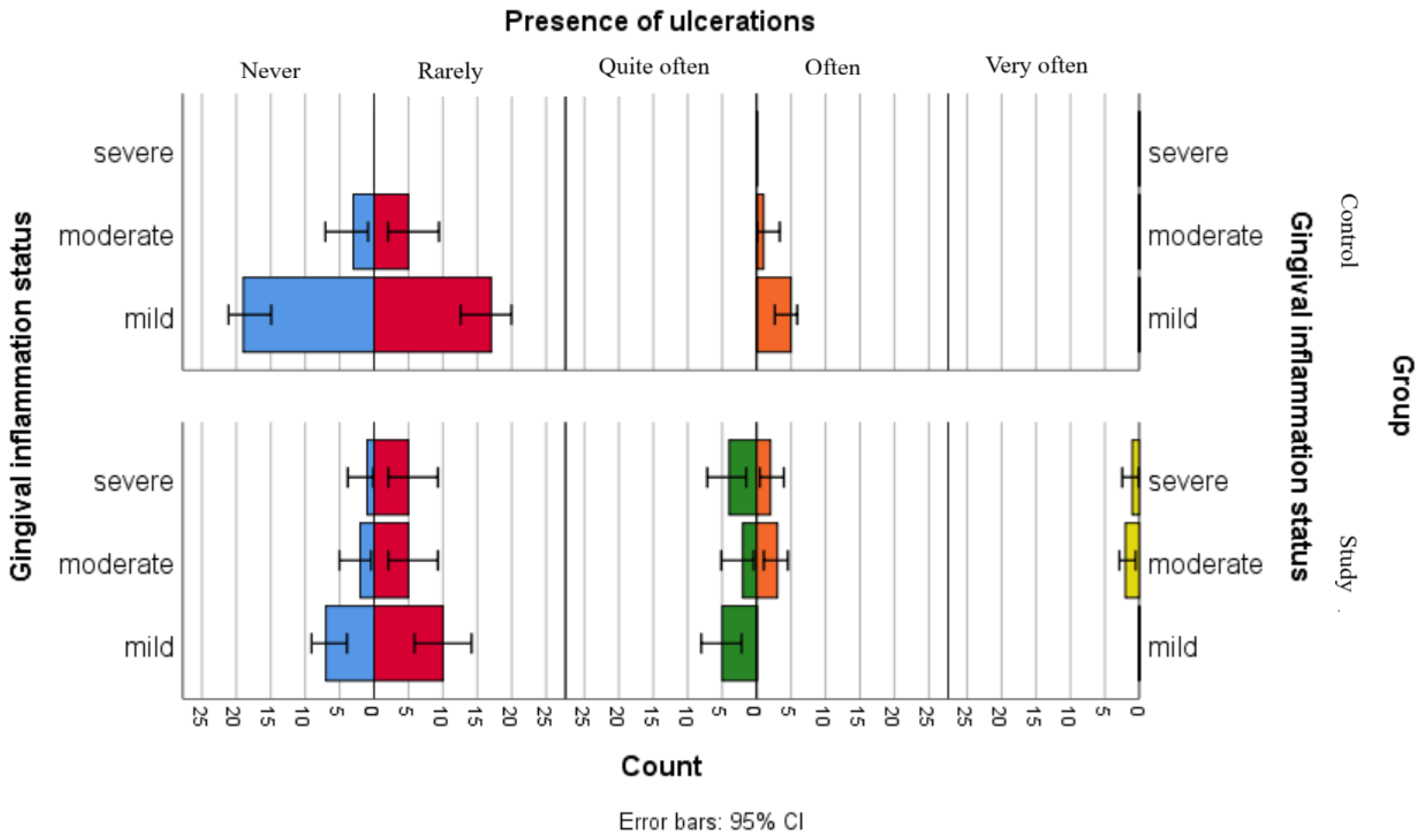| Ulcerations | Never | 7 | 2 | 1 | 10 (20.4) | 10.969 | 0.203 |