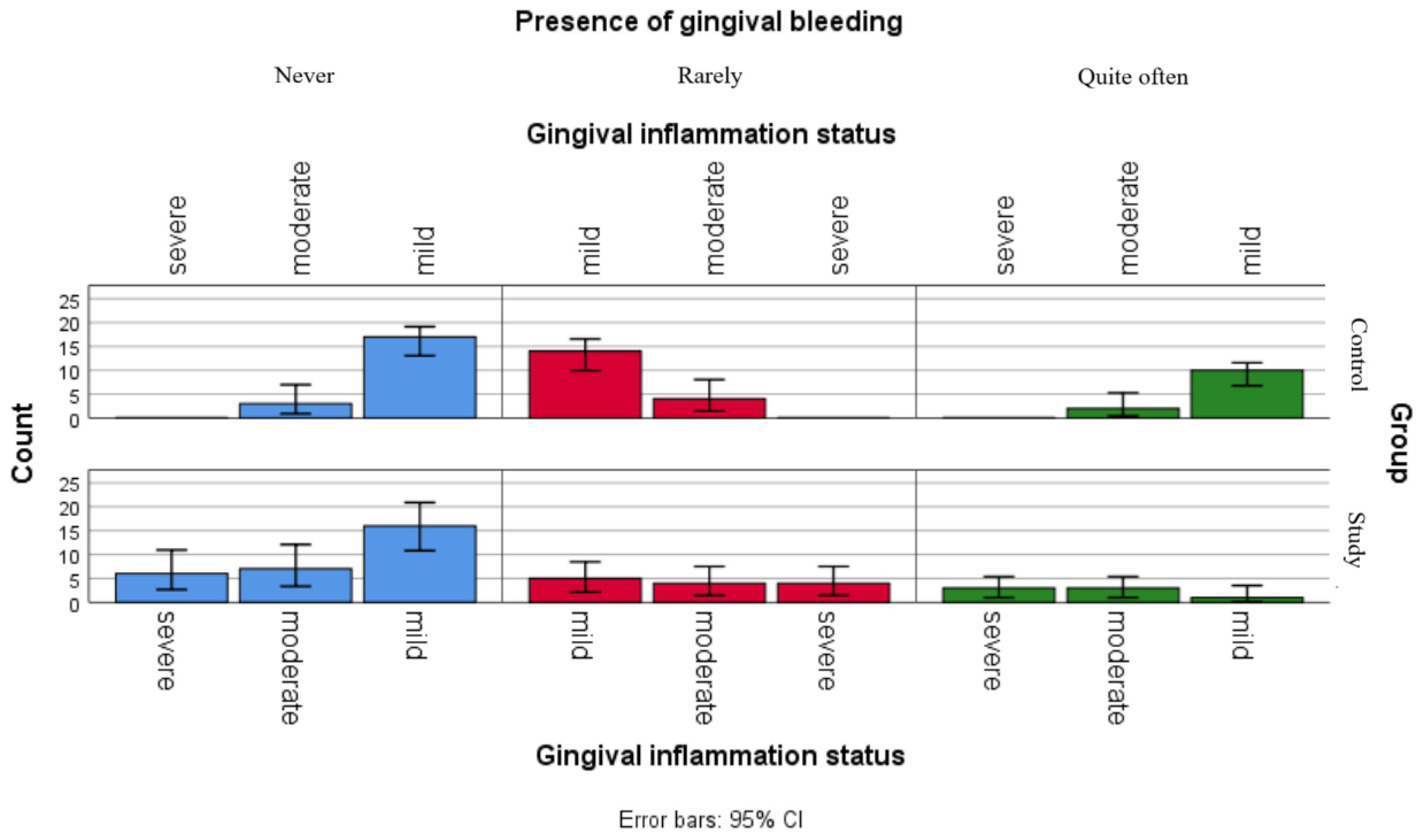| Gingival bleeding | Never | 17 | 3 | 20 (40) | 0.354 | 0.838 |