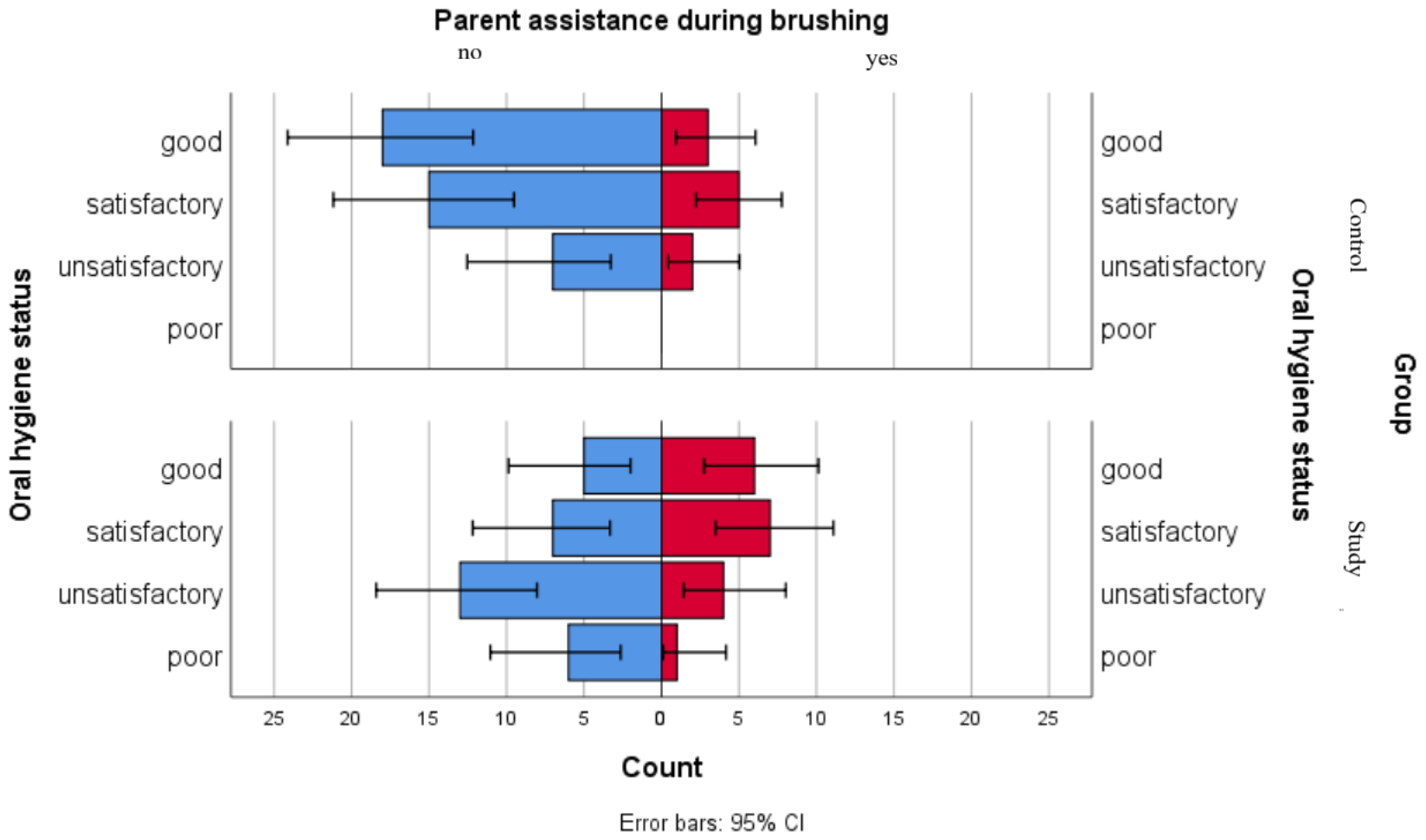 | Parent assistance during brushing | No | 6 | 13 | 7 | 5 | 31 (63.2) | 5.355 | 0.148 * |