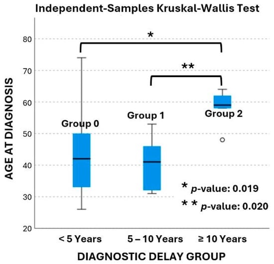 | Diagnostic delay group | 0 (<5 years) | 26 (66.7%) | 2 (50%) | 12 (1.219–118.1) 3 | 0.033 1 |
