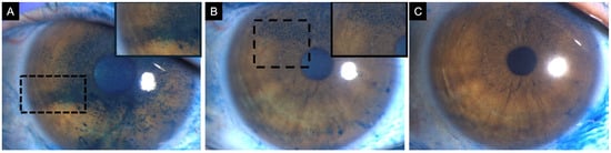 A 47-year-old female patient diagnosed with definite ocular-graft-versus-host disease scheduled for cataract surgery. (A) Baseline corneal lissamine green staining showing positive staining centrally (3 points), inferior (2 points), temporally (2 points), nasally (3 points), and superiorly (3 points), with a total National Eye Institute (NEI) grading score of 13. The patient started treatment with topical 1% methylprednisolone, 5% pooled human immunoglobulin, 50% autologous serum tears, artificial tears, and contact lenses. (B) After 2 months of therapy, corneal lissamine green staining was reduced, and limited only to the superior quadrant (3 points). (C) Post-cataract surgery, corneal lissamine green staining was present only in the superior quadrant (1 point). Insets demonstrate a magnified view of the region with corneal lissamine green staining to enhance clarity.