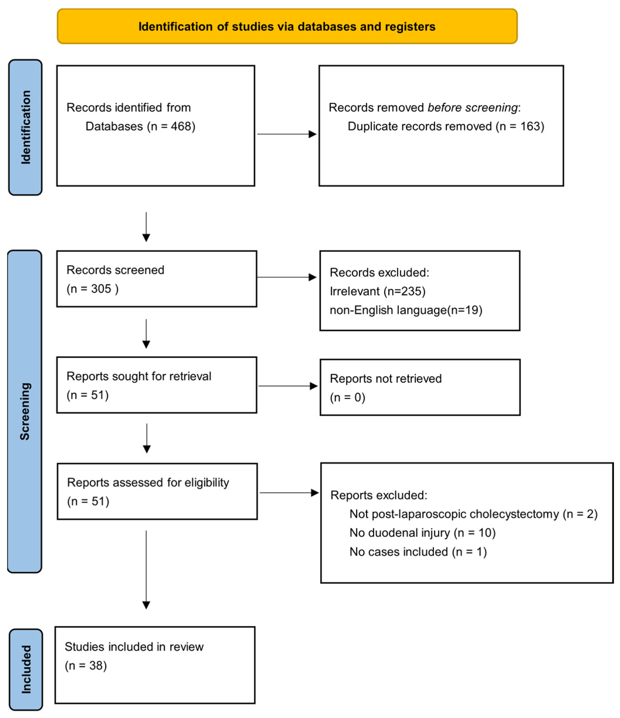- Testini, M.; Piccinni, G.; Lissidini, G.; Di Venere, B.; Gurrado, A.; Poli, E.; Brienza, N.; Biondi, A.; Greco, L.; Nacchiero, M. Management of descending duodenal injuries secondary to laparoscopic cholecystectomy. Dig. Surg. 2008, 25, 12–15. [Google Scholar] [CrossRef] [PubMed]