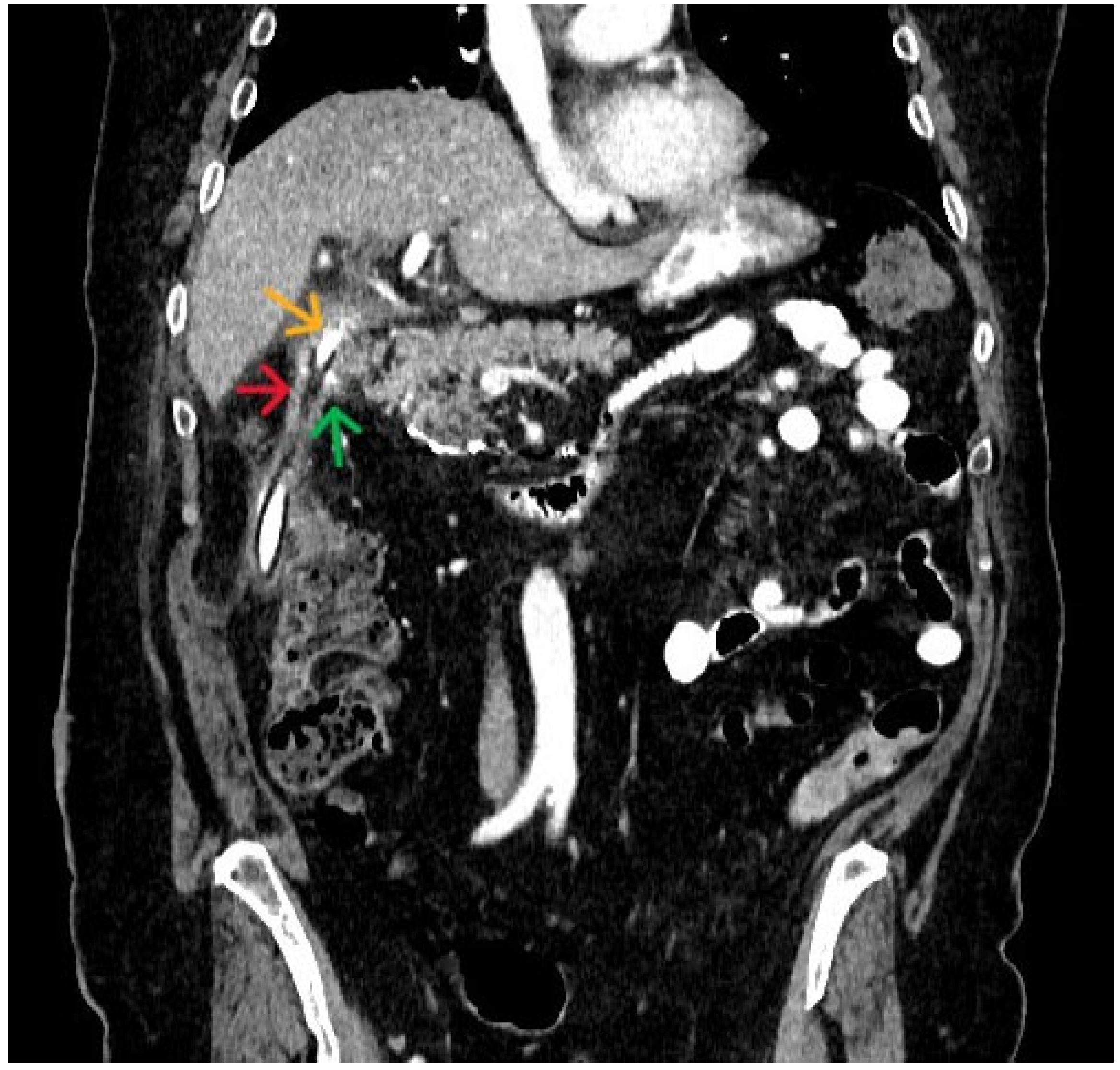 - Berry, S.M.; Ose, K.J.; Bell, R.H.; Fink, A.S. Thermal injury of the posterior duodenum during laparoscopic cholecystectomy. Surg. Endosc. 1994, 8, 197–200. [Google Scholar] [CrossRef] [PubMed]