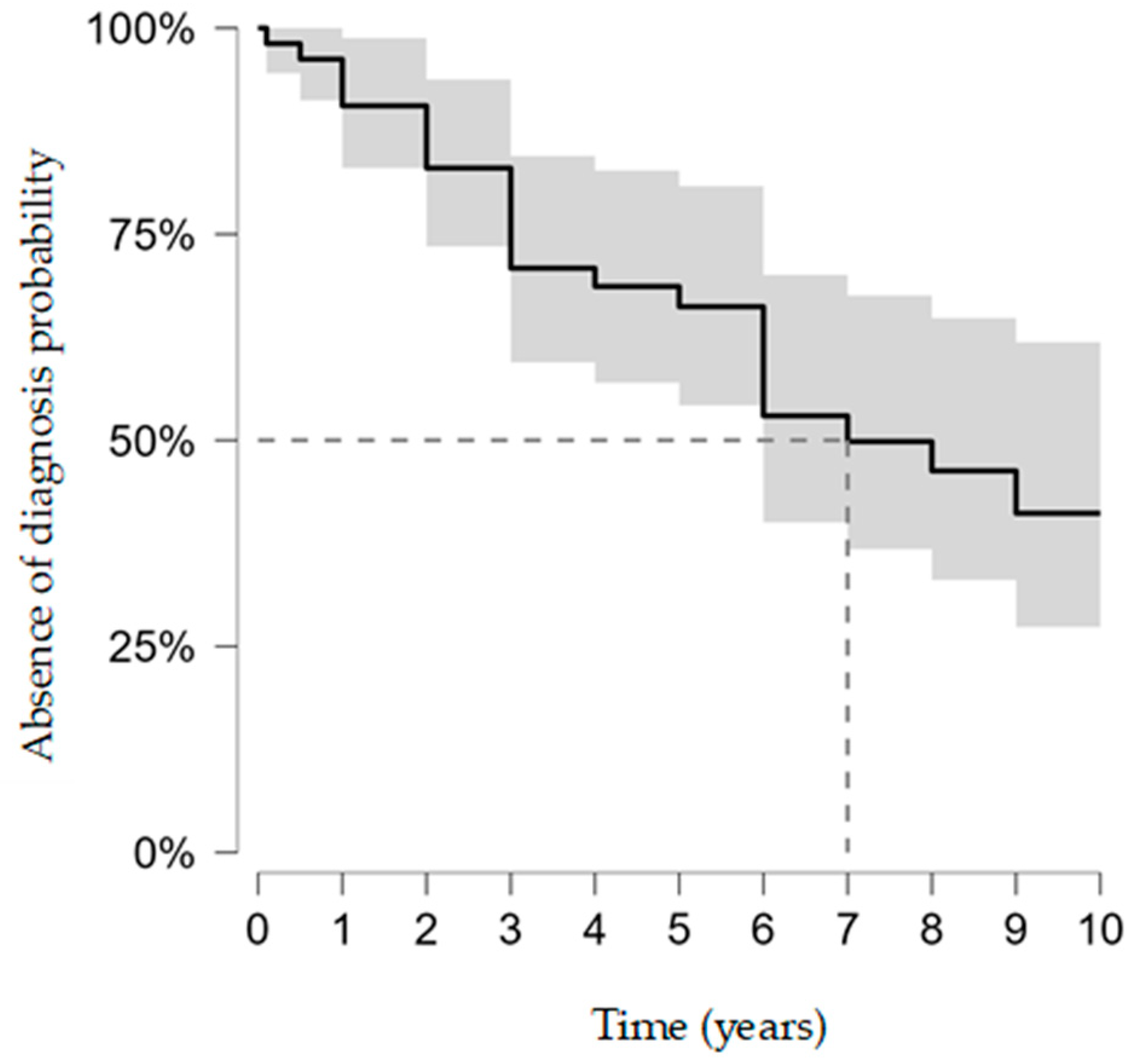 Time-to-detection was analyzed using Kaplan–Meier curves of the probability of remaining diagnosis-free (95% CIs). Administrative censoring was pre-specified at τ = 10 years to ensure estimator stability (adequate numbers at risk) and interpretability.