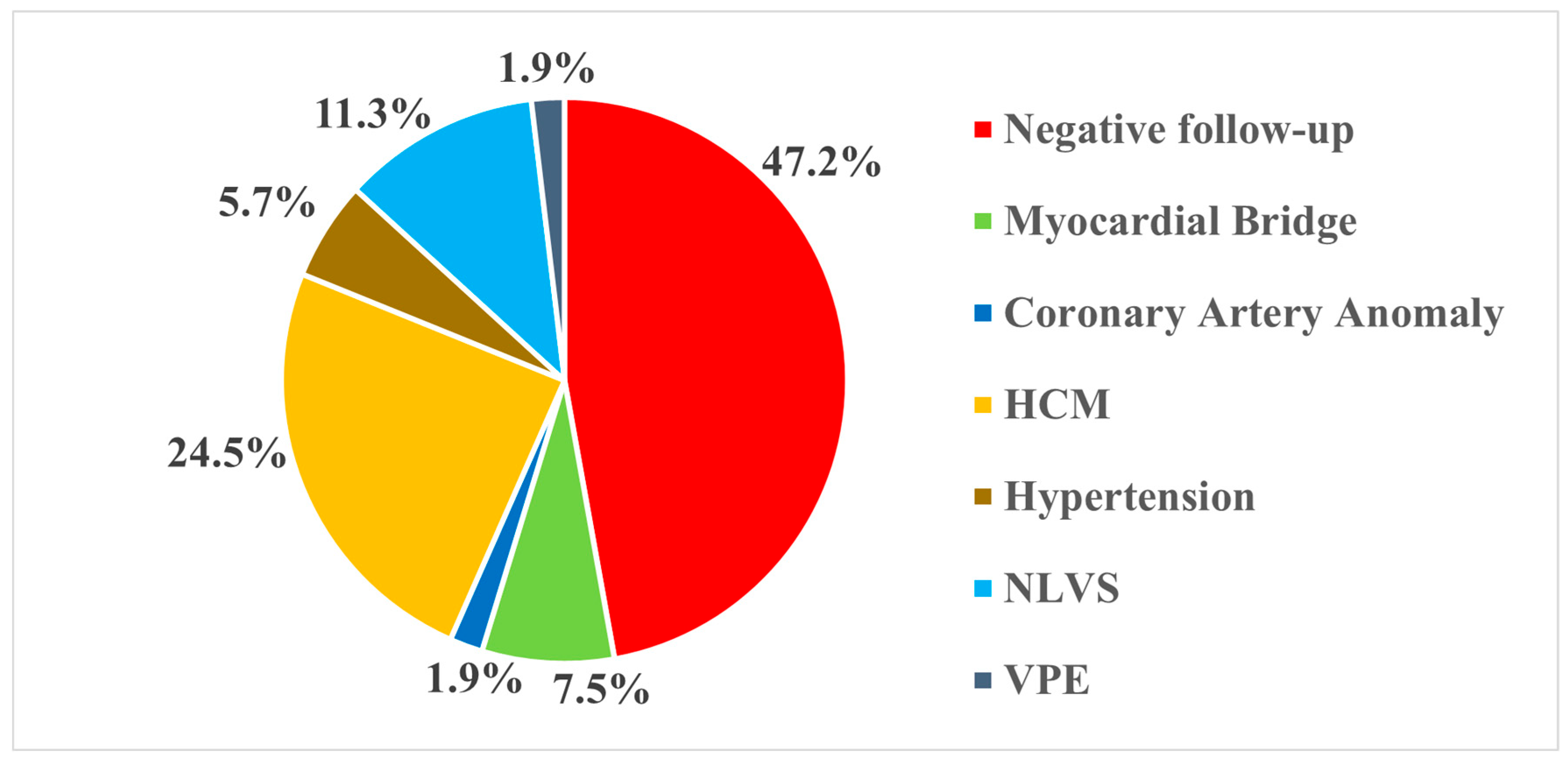 Among the diagnoses achieved, Hypertrophic Cardiomyopathy (HCM) (13, 24.5%) and Non-Ischemic Left Ventricular Scar (NLVS) (6, 11.3%) accounted for more than one-third of cases (35.8%), followed by myocardial bridge (4, 7.5%), arterial hypertension with ventricular remodeling (3, 5.7%), coronary artery anomaly (1, 1.9%), and ventricular pre-excitation (1, 1.9%) (Figure 2).