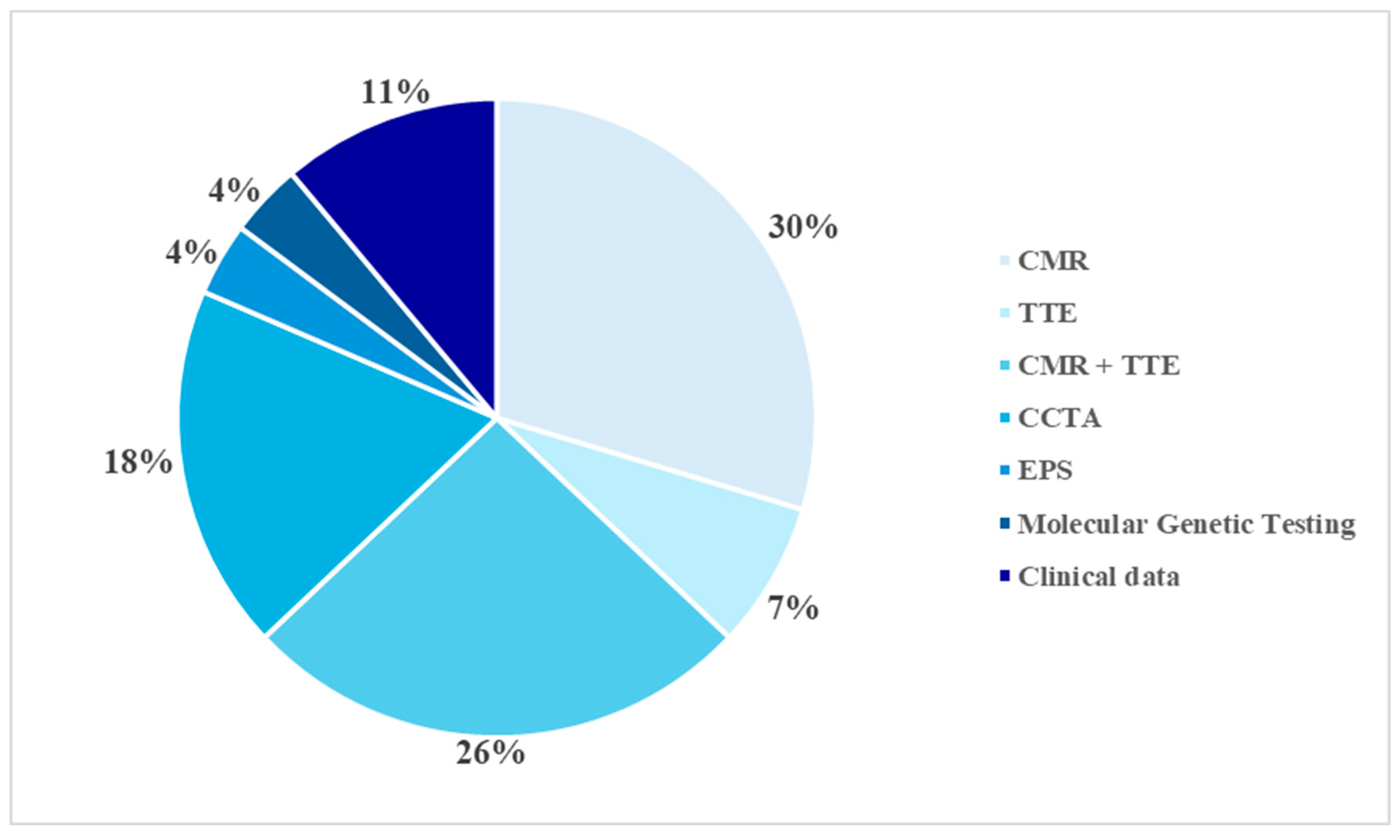 Figure 3. Diagnostic methods. CMR: Cardiac Magnetic Resonance; TTE: Transthoracic Echocardiography; CCTA: Computed Coronary Tomography Angiography; EPS: Electrophysiological Study.