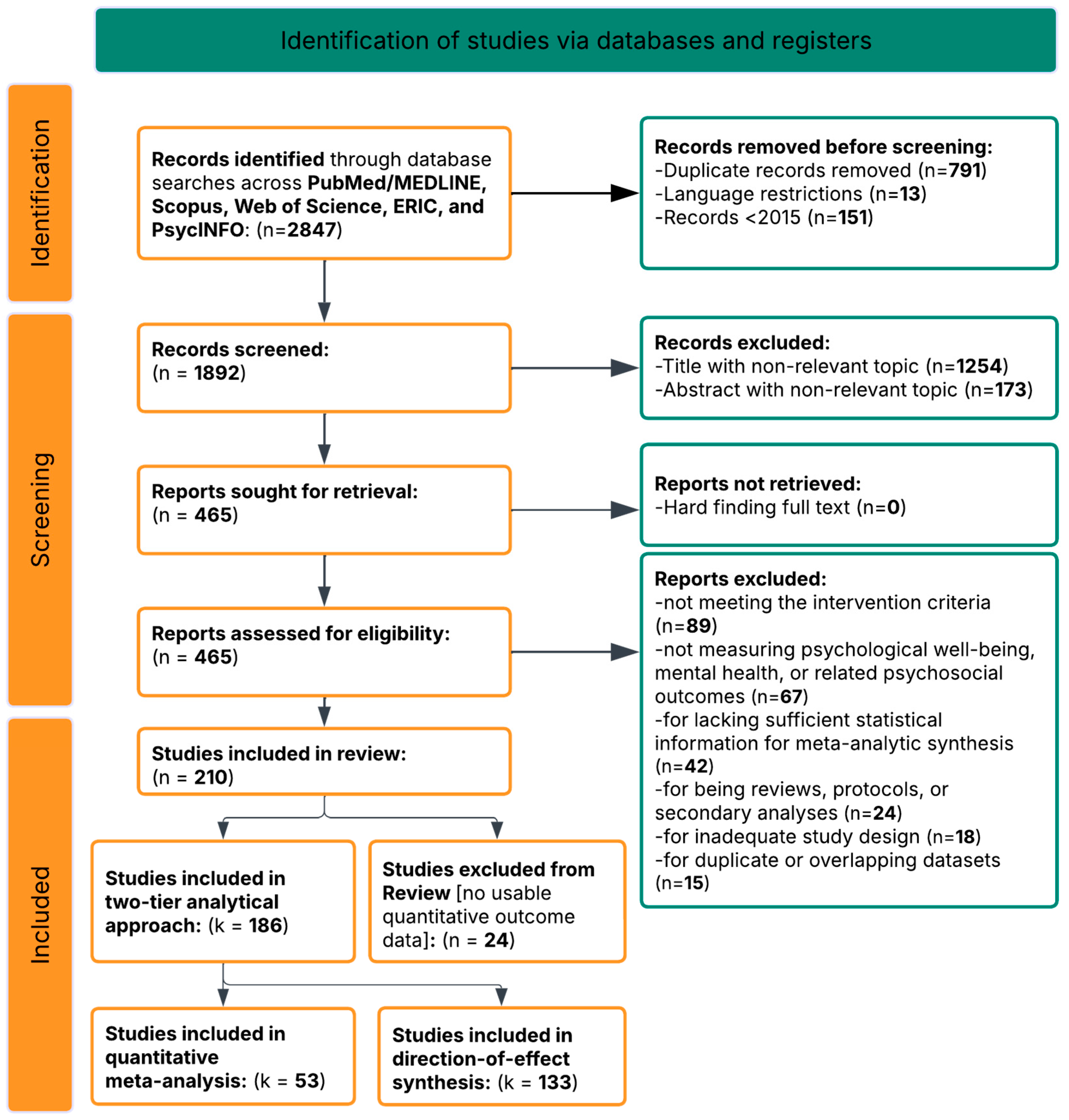 Application of these criteria to the 465 full-text reports assessed for eligibility resulted in the exclusion of 255 reports for the following reasons: not meeting intervention criteria (n = 89), not measuring psychological well-being, mental health, or related psychosocial outcomes (n = 67), lacking sufficient statistical information for meta-analytic synthesis (n = 42), being reviews, protocols, or secondary analyses (n = 24), inadequate study design (n = 18), and duplicate or overlapping datasets (n = 15). A total of 210 studies met the inclusion criteria for the systematic review. Of these, 186 studies were included in the final review: 53 studies (28.5%) provided data in formats permitting standardized effect size calculation (Hedges’ g) and constitute the quantitative meta-analytic subset, while 133 studies (71.5%) met all inclusion criteria but reported outcomes in formats not convertible to Hedges’ g and were included in the direction-of-effect narrative synthesis following SWiM guidelines. The remaining 24 studies were excluded at the eligibility stage for meeting one or more exclusion criteria (study protocol only, qualitative design, systematic review/meta-analysis, or absence of any usable outcome data). This 24-study subset is distinct from the 42 records excluded at eligibility screening for lacking sufficient statistical information; those 42 records reported no usable quantitative outcome data whatsoever. The complete study selection process is depicted in the PRISMA flow diagram (Figure 1). Characteristics of all 186 included studies are presented in Supplementary Table S1, and the complete study-level dataset, including effect sizes for the quantitative subset, direction-of-effect classifications for all studies, and all coded moderator variables, is provided in Supplementary Table S2.