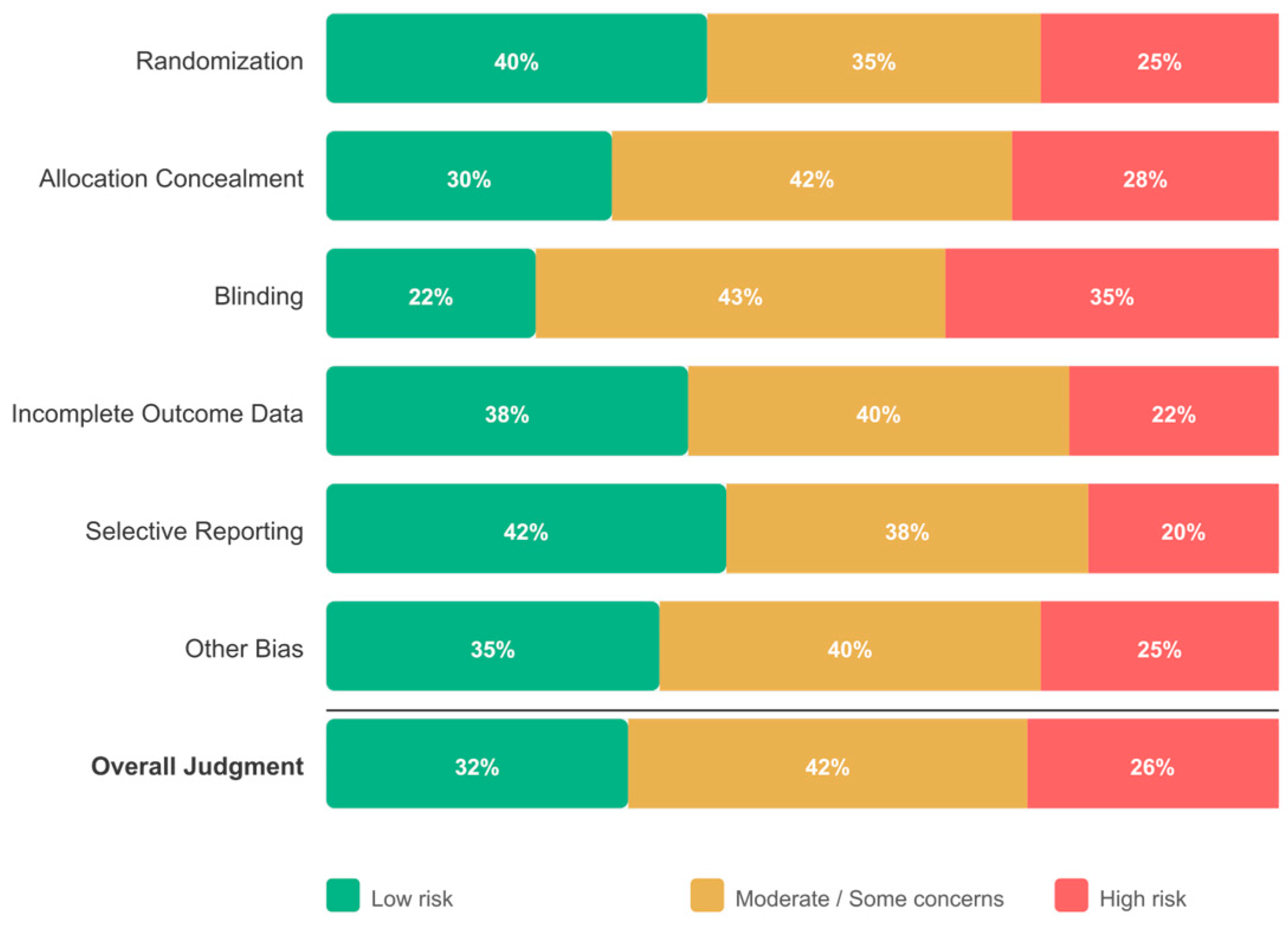 Overall, 59 studies (31.7%) were rated as low risk of bias, 78 (41.9%) as moderate risk, and 49 (26.3%) as high risk. This distribution indicates that many included studies (68.3%) had methodological limitations, which is addressed through sensitivity analyses restricted to low-risk-of-bias studies within the quantitative subset.