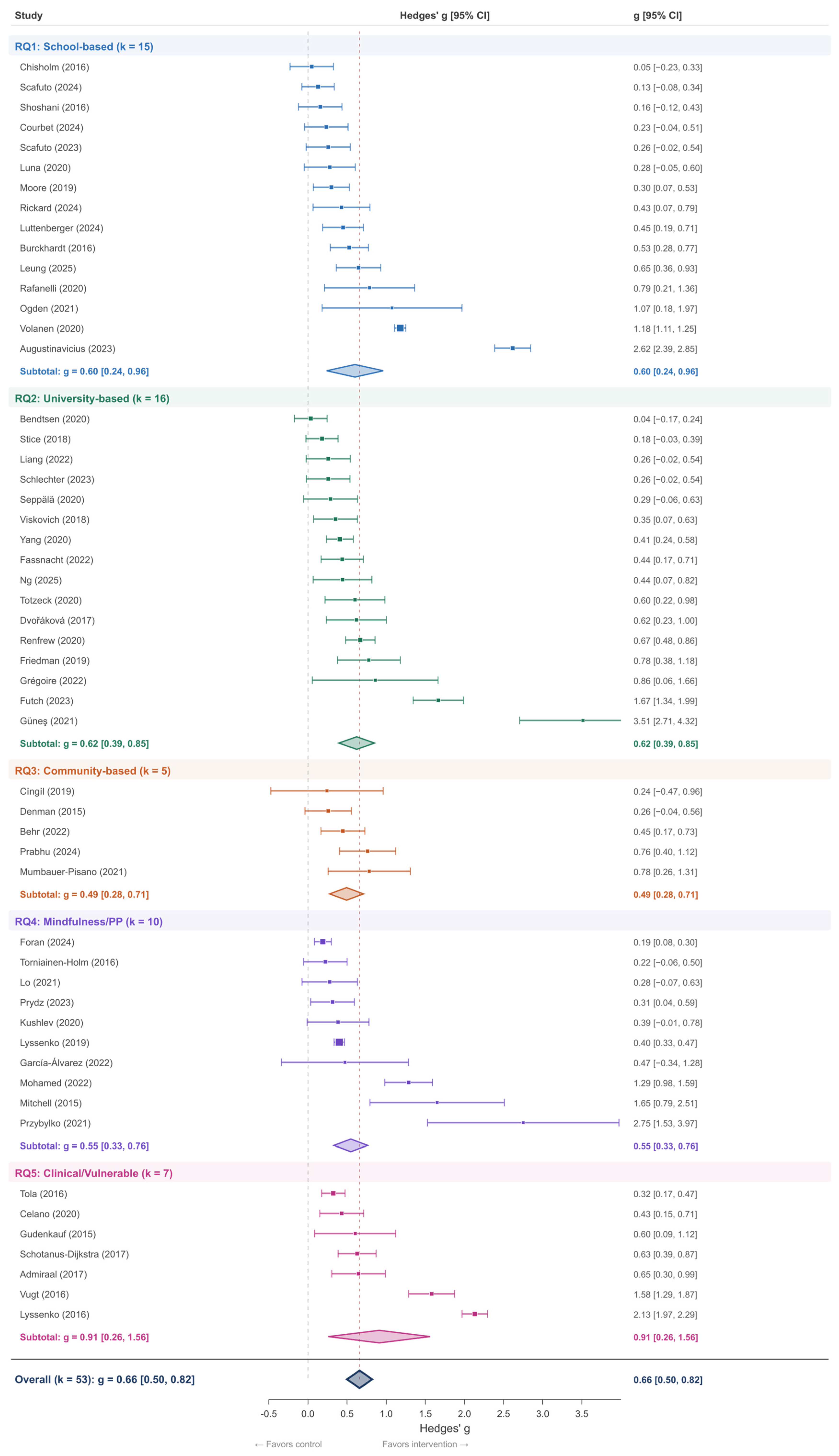Figure 3. Forest Plot of Effect Sizes in the Quantitative Subset (k = 53). Each study is identified by first author and year; full references are provided in the reference list [118,119,120,121,122,123,124,125,126,127,128,129,130,131,132,133,134,135,136,137,138,139,140,141,142,143,144,145,146,147,148,149,150,151,152,153,154,155,156,157,158,159,160,161,162,163,164,165,166,167,168,169,170,171,172,173,174,175,176,177,178,179,180,181,182,183,184,185,186,187,188,189,190,191,192,193,194,195,196,197,198,199,200,201,202,203,204,205,206,207,208,209,210,211,212,213,214,215,216,217,218,219,220,221,222,223,224,225,226,227,228,229,230,231,232,233,234,235,236,237,238,239,240,241,242,243,244,245,246,247,248,249,250,251,252,253,254,255,256,257,258,259,260,261,262,263,264,265,266,267,268,269,270,271,272,273,274,275,276,277,278,279,280,281,282,283,284,285,286,287,288,289,290,291,292,293,294,295,296,297,298,299,300,301,302,303]. The DerSimonian–Laird random-effects model was used [109]. Studies are grouped by research question and sorted by effect size within each group. Squares represent individual study effect sizes, with square area proportional to study weight (inverse-variance). Horizontal lines through squares represent 95% confidence intervals. Diamonds represent pooled subgroup estimates (colored by research question) and the overall pooled estimate (dark blue). The solid grey dashed vertical line indicates the null effect (g = 0). The red dashed vertical line indicates the overall pooled estimate (g = 0.66). Colors denote research questions: blue = RQ1 School-based (k = 15), green = RQ2 University-based (k = 16), orange = RQ3 Community-based (k = 5), purple = RQ4 Mindfulness/Positive Psychology (k = 10), pink = RQ5 Clinical/Vulnerable (k = 7). Overall pooled effect: g = 0.66, 95% CI [0.50, 0.82], I2 = 96.1%.