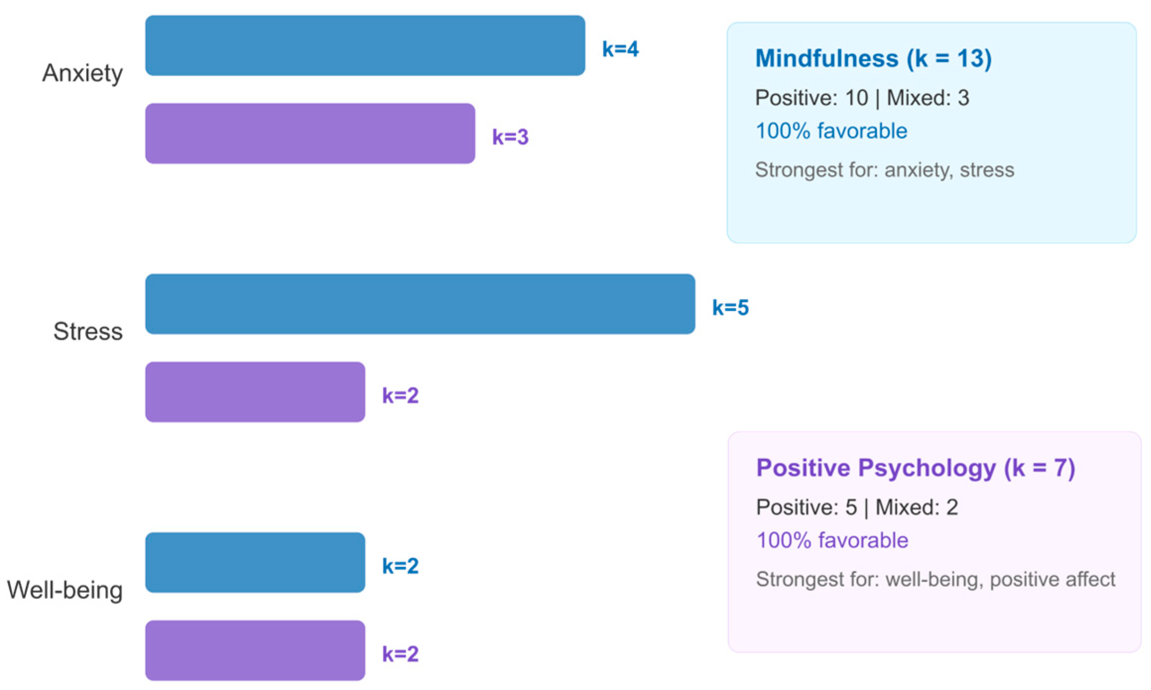 Figure 8. Comparative Patterns of Mindfulness vs. Positive Psychology Interventions by Outcome Domain (RQ4, k = 22). Note: Direction-of-effect patterns by modality. Mindfulness-based programs (k = 13) showed predominantly positive effects on anxiety and stress; positive psychology programs (k = 9) showed predominantly positive effects on well-being and positive affect. All 22 studies reported favorable outcomes (100%).