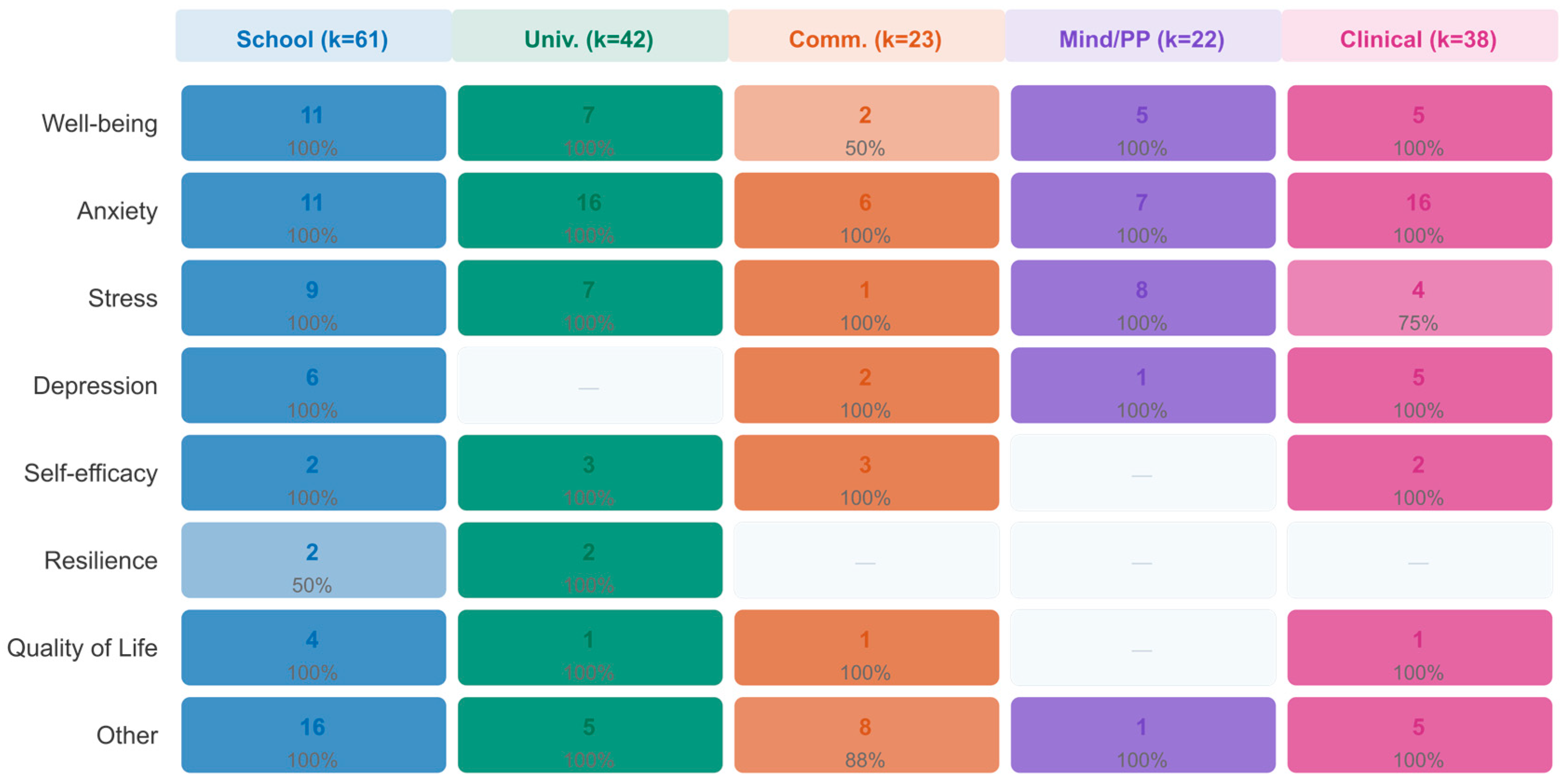 RQ4: How effective are mindfulness and positive psychology interventions across settings, and do outcome-specific differential patterns emerge that could inform modality-matched intervention selection?