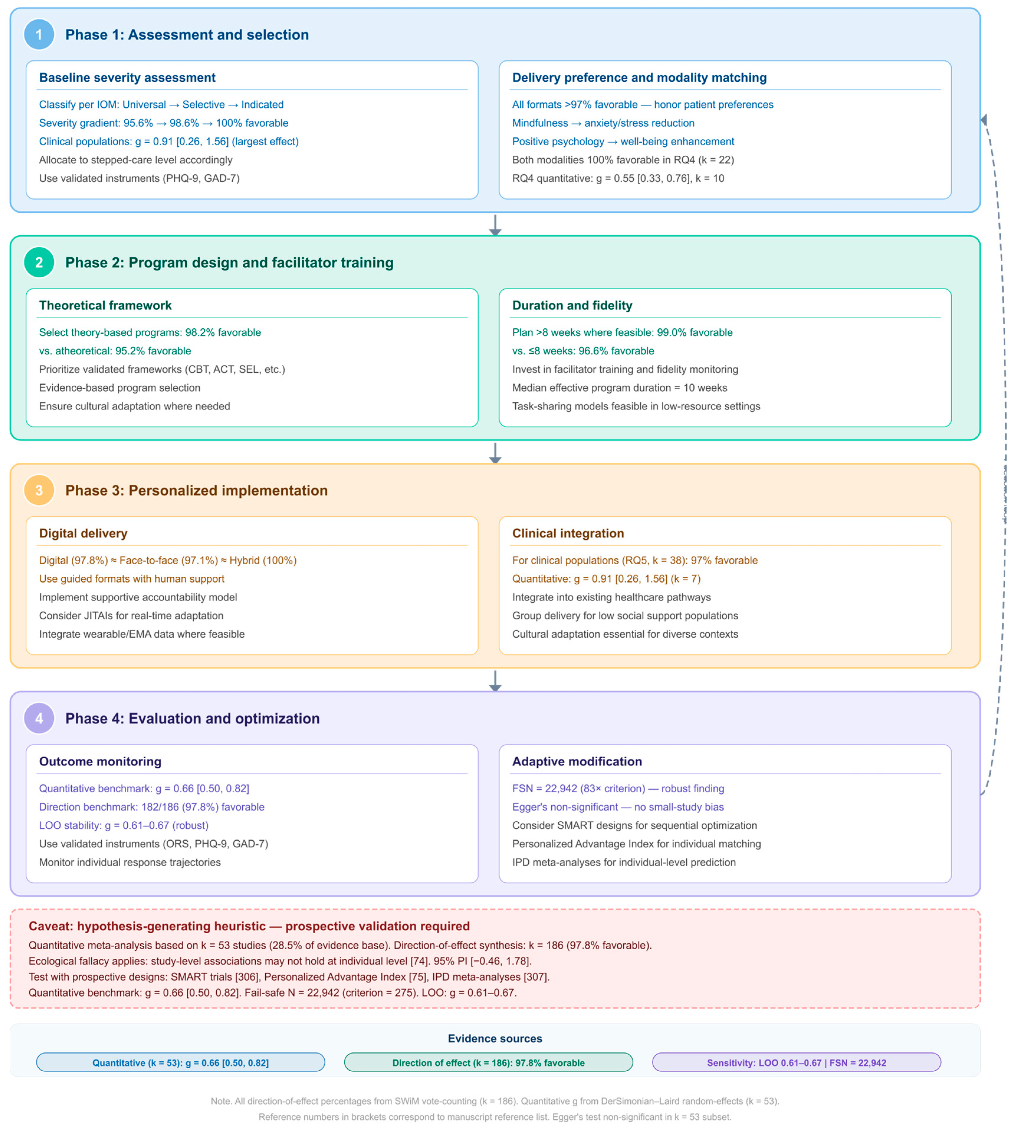 Note. Direction-of-effect vote-counting across all 186 included studies following SWiM guidelines. Favorable = studies reporting positive or mixed results (positive: statistically significant benefit on ≥1 primary outcome; mixed: some outcomes significant, others not). Direction classified from study summaries, findings, and intervention effects columns in the primary database. Moderator k-values verified against Supplementary Tables: duration (89 + 97 = 186), framework (165 + 21 = 186), severity (68 + 72 + 46 = 186), and control condition (64 + 122 = 186). Study design, risk of bias, delivery format, and per-RQ direction-of-effect distributions are reported in Table 2 and are not duplicated here. a Duration categories from original systematic coding; ≤8 weeks and >8 weeks defined by the reported intervention period. The stepped severity gradient (95.6% → 98.6% → 100%) and the theory-based advantage (98.2% vs. 95.2%) inform Phase 1 and Phase 2 of the proposed implementation framework.