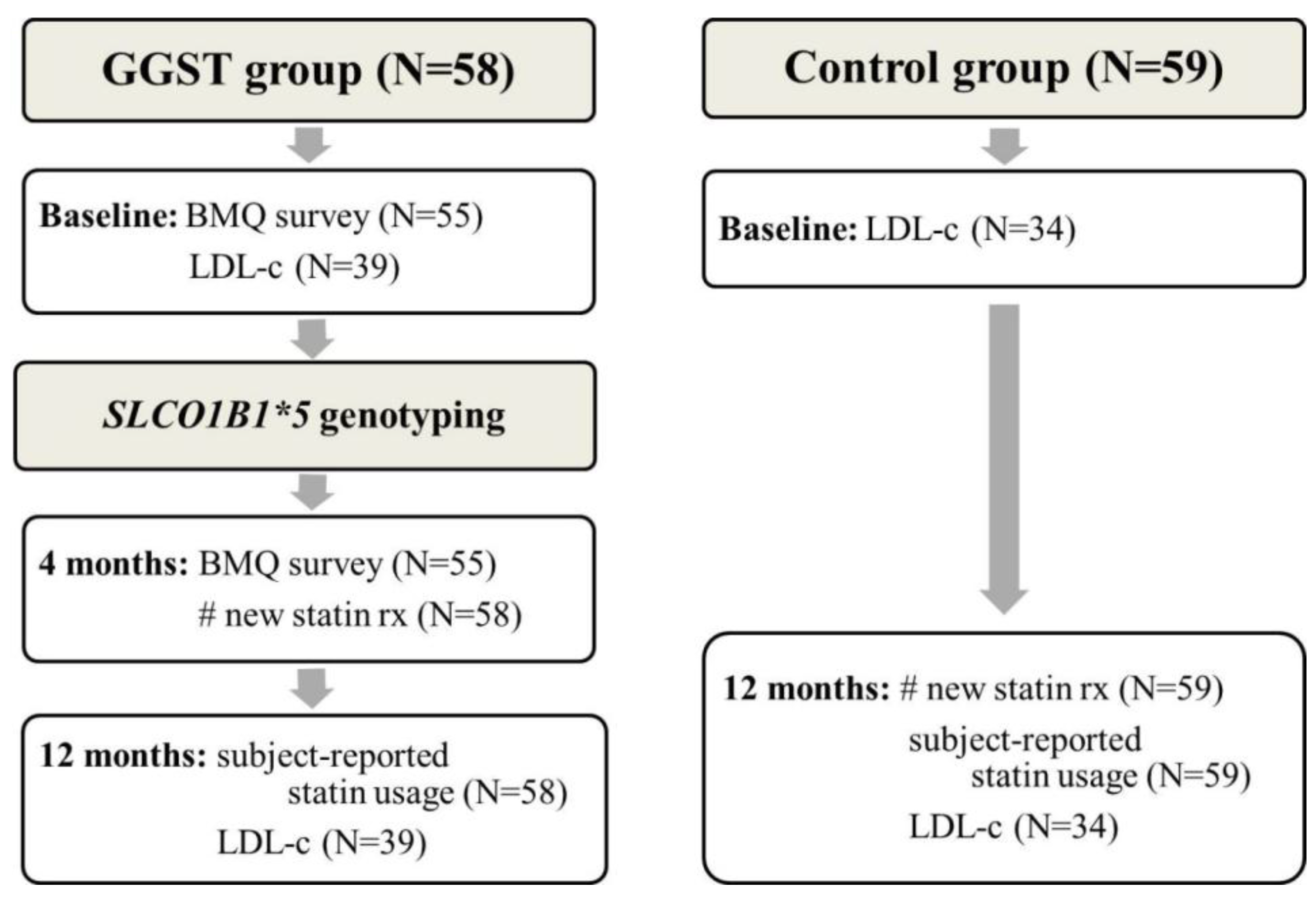Hardy-Weinberg Equilibrium for *5 was checked in Caucasians within the GGST group. Differences in baseline characteristics between GGST and control subjects were assessed using a two-sided t-test for continuous variables and Fisher’s exact test for categorical variables. For all variables that did not approximate a normal distribution, non-parametric tests were utilized and did not alter the conclusions. A paired t-test assessed changes from baseline to four months in the BMQ. Logistic regression tested the association between GGST and the proportion of new statin prescriptions and subject-reported statin usage. To compare the change in LDL-c from baseline to one-year follow-up in the GGST and control groups, a paired t-test was used. To assess the association of GGST on the change in LDL-c from baseline to one-year follow-up, analysis of variance (ANOVA) was used. Multivariable adjustment was performed for secondary outcomes, adjusting for any differences in baseline characteristics between the GGST and control groups. Because clinicians rarely interpret LDL-c in isolation and instead utilize the patients’ NCEP-defined LDL-c goal to initiate statin therapy, we adjusted for the proportion of individuals at NCEP goal at baseline. Statistical analyses were performed using R statistical software [35].