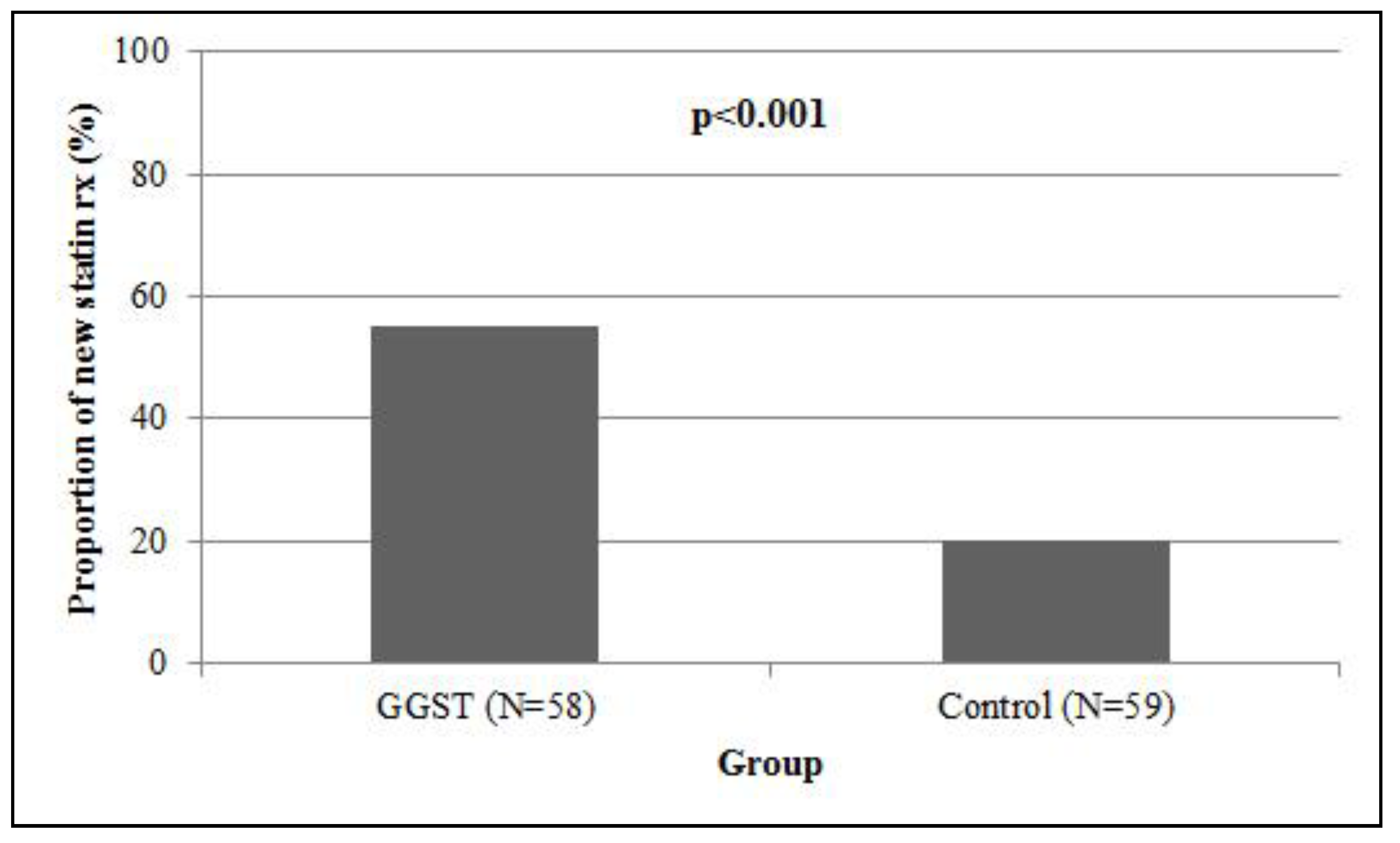 Association of GGST with new statin prescriptions. Individuals receiving GGST had a higher proportion (55%) at four months following genotyping compared to control subjects (20%) followed for one year. GGST = genotype guided statin therapy.