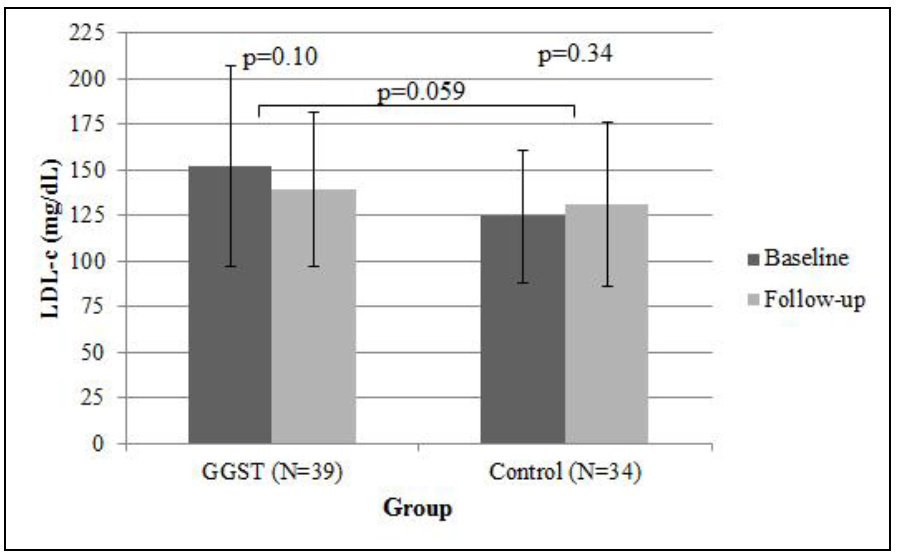 Association of GGST with change in LDL-c. Displayed are means and standard error bars of LDL-c. Individuals receiving GGST had a greater decrease in LDL-c (−12.4 ± 45.4 mg/dL) compared to control subjects (6.3 ± 37.8) over one-year follow-up. GGST = genotype guided statin therapy; LDL-c = low-density lipoprotein cholesterol.