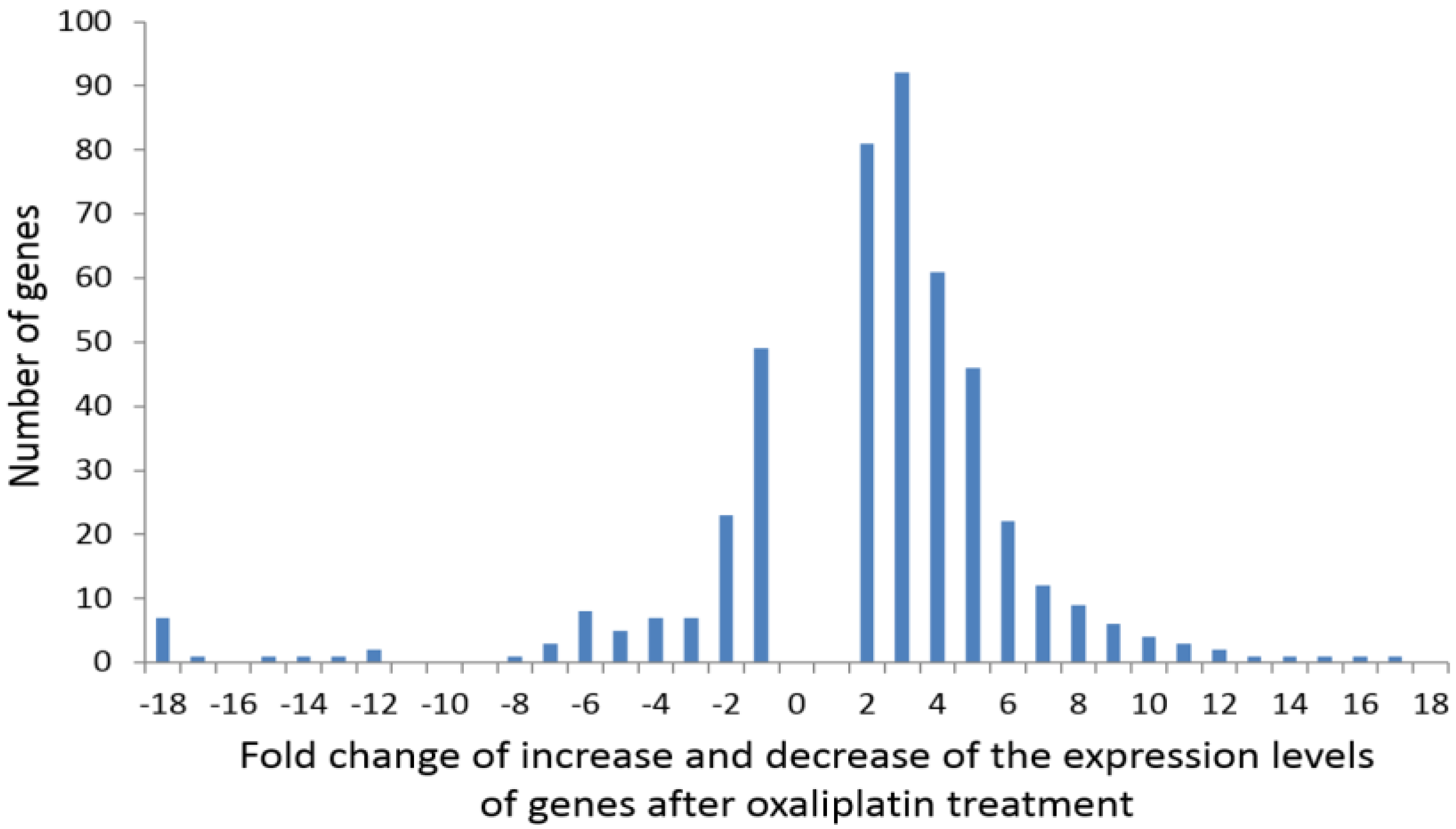 Distribution of frequencies of the genes whose expression showed a given-fold increase or decrease after oxaliplatin treatment.