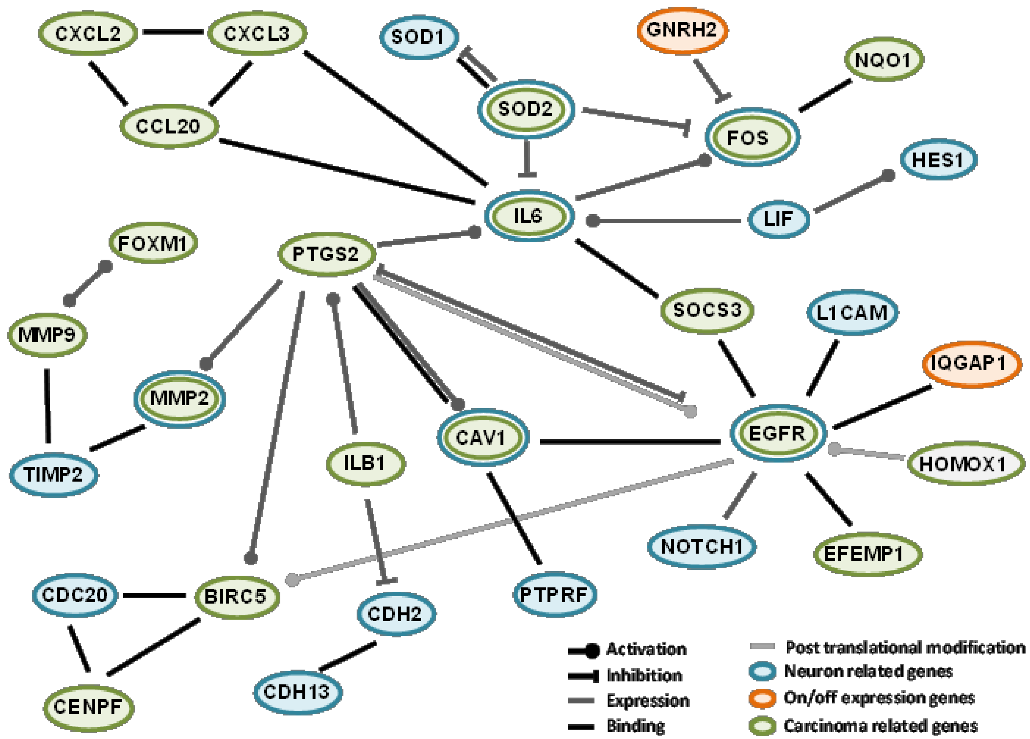 To generate the OXPN-network, we took into account several facts, for instance, that IQGAP1 binds to EGFR and GNRH2 inhibits fos gene expression [41,42]. EGFR and fos are involved in biological processes including neurogenesis, neuron differentiation, and neuron development, and also breast neoplasm and hepatocellular carcinoma. EGFR expression increases after CT, while fos gene expression is diminished. “fos” is part of the activator protein-1 (AP-1) transcription factor implicated in the regulation of cell proliferation, differentiation, and transformation [43]. In the brain, AP-1 transient activation is related to neuronal plasticity [44,45]. IQGAP1 has been proposed as a modulator of EGFR receptor activation [41]. Activated EGFR recruits downstream signaling molecules, leading to the activation of different pathways important in tumor growth, progression, and survival [46,47]. Moreover, EGFR nuclear accumulation has been linked to malignant phenotypes such as therapeutic resistance [48]. EGFR also plays an important role in nervous system development affecting neural cell survival, proliferation, and differentiation [49,50,51]. In the network we show that EGFR also associates with other proteins implicated in this process such us L1CAM, a cell adhesion molecule involved in neuron-neuron adhesion and neurite fasciculation [52,53], BIRC5, a member of the inhibitor of apoptosis (IAP) gene family that prevents apoptosis [54,55], and EFEM1, an extracellular matrix glycoprotein with a possible role in tumor aggressiveness [56,57,58].