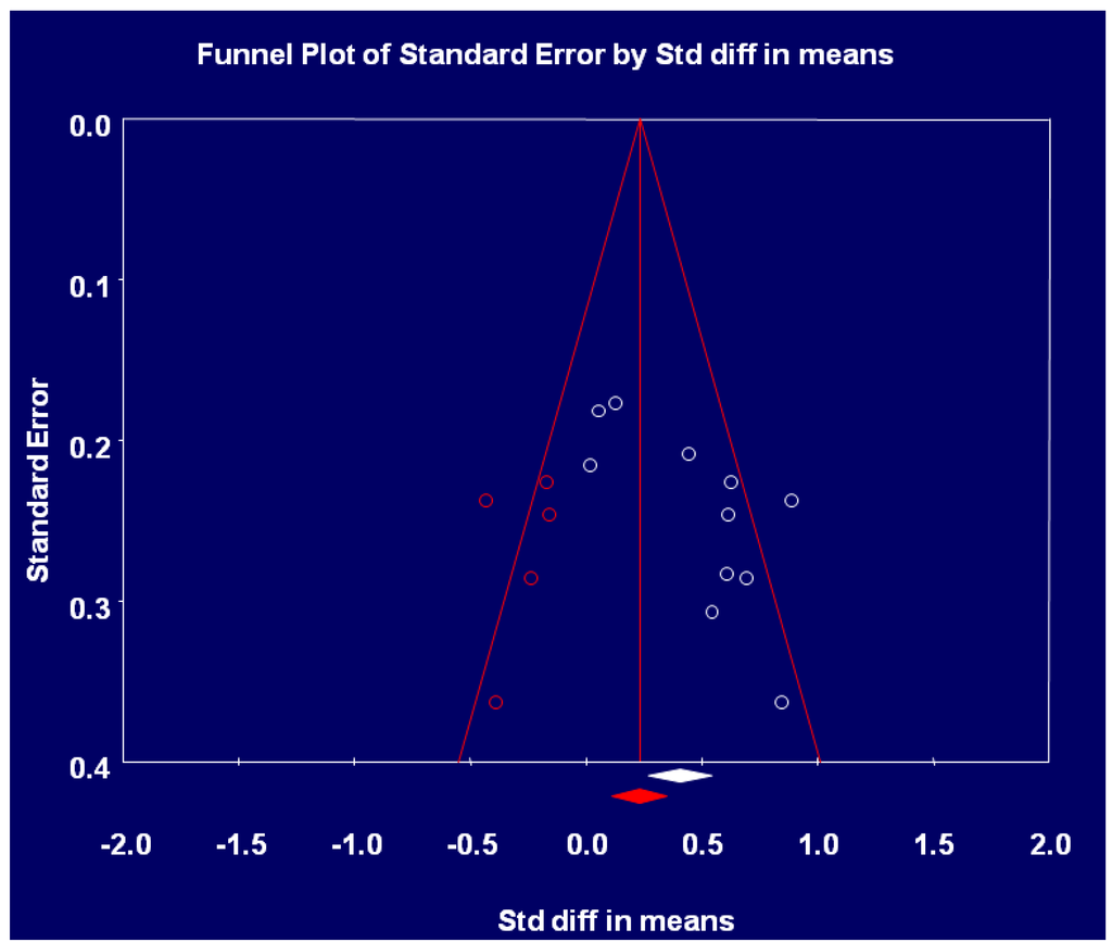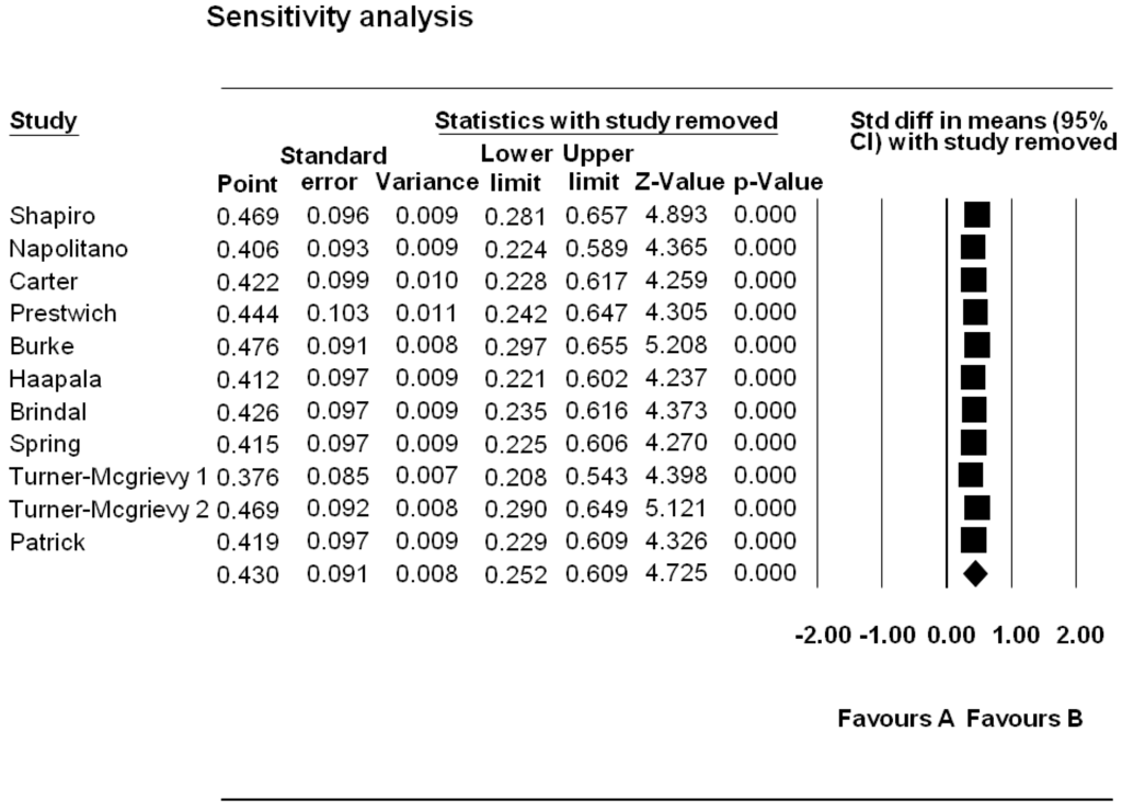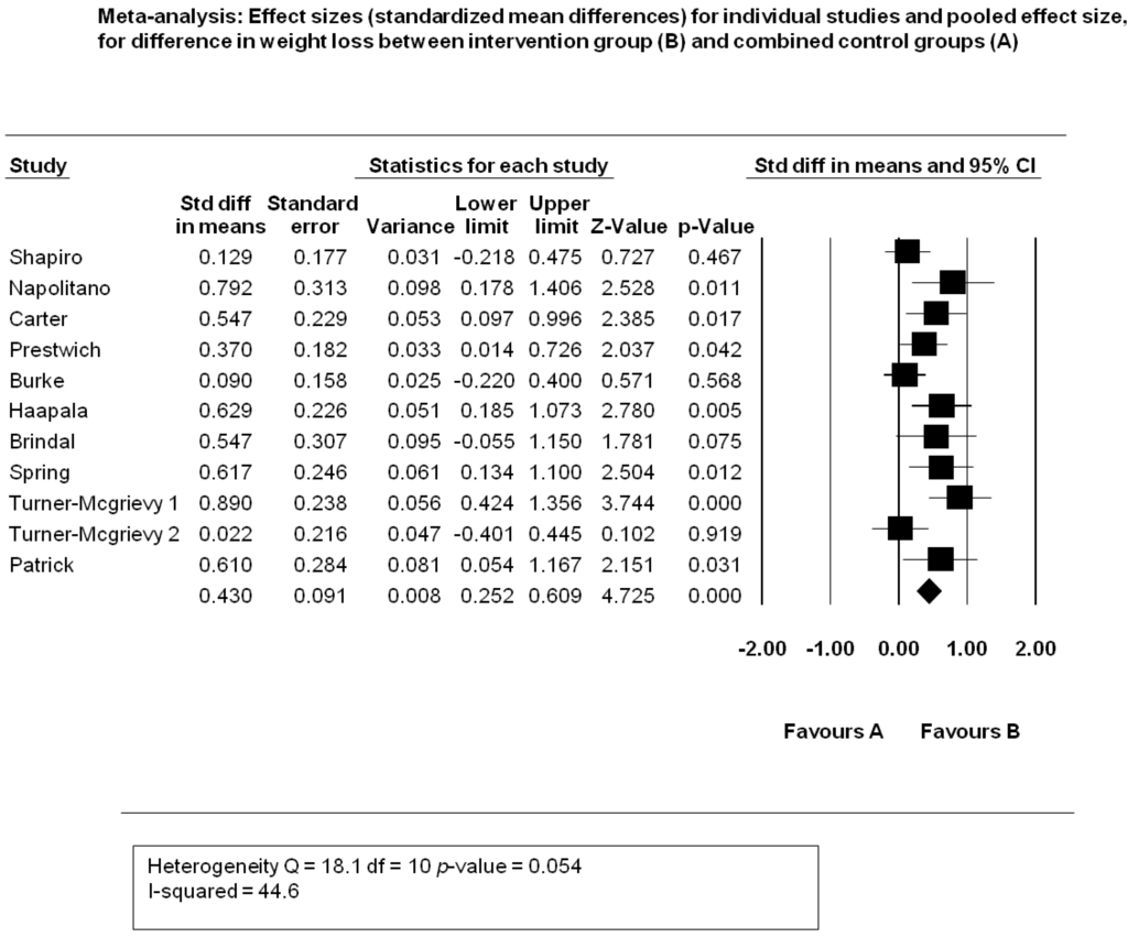 In order to answer this question, a systematic review and meta-analysis were undertaken. First, this review found that weight loss interventions by a mobile device medium induce weight loss. The meta-analysis results favoured mobile device interventions for weight loss. The meta-analysis found an overall medium effect size of 0.430 (95% CI = 0.252–0.609) (p-value ≤ 0.01). Using the tabular conversion to percentage of overlap in [47], an effect size of 0.40 indicates that 66% of the control group would have a mean weight loss value below the average weight loss in the intervention group. Inferences that may be drawn from the meta-analysis are that overall, the pooled significant medium effect size favours mobile device intervention groups. Throughout this review, weight loss favouring mobile devices was found when comparing baseline weight with post-intervention weight as well as when comparing the amount of weight loss between intervention and control groups. The intervention groups were compared with varying controls including standard no treatment controls as well as controls receiving diverse non-mobile device weight loss interventions, indicating that mobile devices may be induce more favourable weight loss when compared with these groups. However, the interpretation of the overall weight loss has been warranted to be interpreted with caution due to the possibility of some publication bias. Nonetheless, the imputed effect size in the absence of publication bias indicates that the overall effect size, while smaller, would likely still be away from the null, favouring mobile interventions for weight loss.