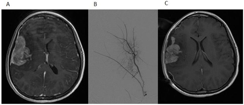 (A) The post-contrast T1-weighted MRI image shows a predominantly heterogeneously enhancing mass extending into the right Sylvian fissure with probable invasion of the adjacent insular cortex; (B) a select image from the tumor embolization demonstrates a dramatically hypervascular tumor supplied by branches of the right middle meningeal artery that was successfully embolized with polyvinyl alcohol particles; (C) the postoperative T1-weighted MRI image with contrast demonstrates partial resection of the tumor.