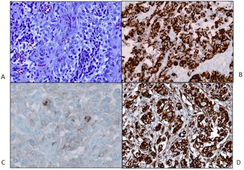 (A) Primary tumor. H&E stain. 200× magnification. The neoplasm is relatively cellular and formed of crowded polygonal cells with variable amounts of pale eosinophilic or clear cytoplasm. Nuclei are round to oval and often irregular, and they are vesicular with occasional small nucleoli. Binucleated tumor cells are present. Mitotic figures are rare. A few small tumor cells have slightly expanded cytoplasm with fibrous inclusions (nonspecific rhabdoid cells). Thin fibrovascular septa, mostly with capillary-size vessels, are present, forming vague small lobules in many areas; (B) Primary tumor. GFAP stain; 200× magnification; (C) Primary tumor. Synaptophysin stain; 400× magnification; (D) Primary tumor. Nestin stain of tumor; 200× magnification.