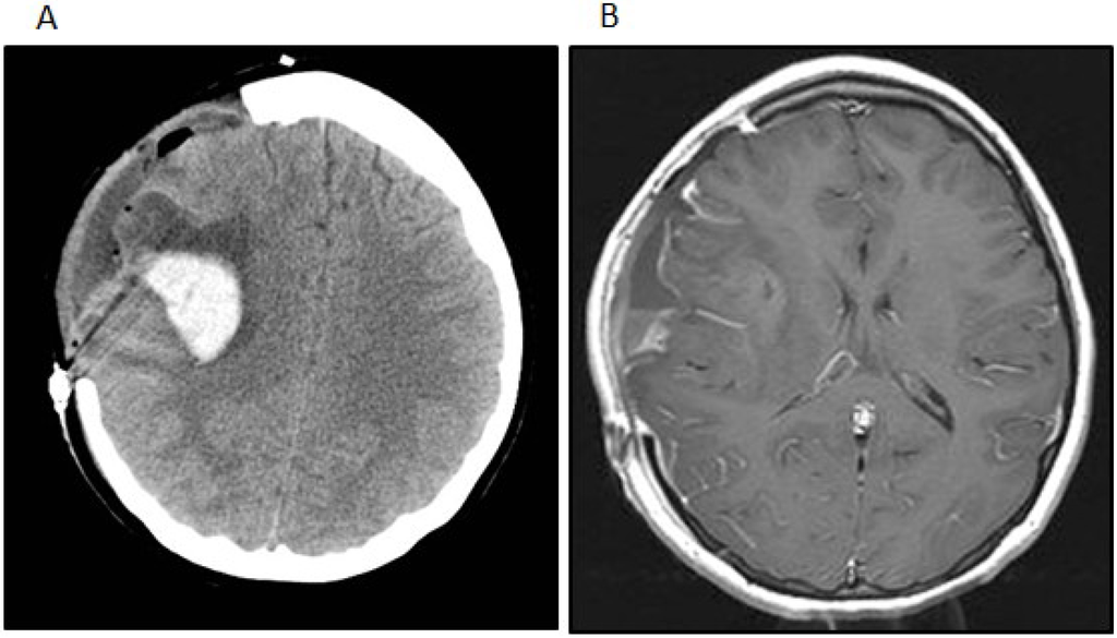 (A) The patient developed a delayed intratumoral hemorrhage requiring hemicraniectomy and evacuation of the hemorrhage and tumor. The noncontrast head CT shows the acute hemorrhage within the right Sylvian fissure extending into the right frontal lobe; (B) The post-contrast t1-weighted image after the second surgery shows subtotal removal of the neoplasm and evacuation of the intratumoral hemorrhage.