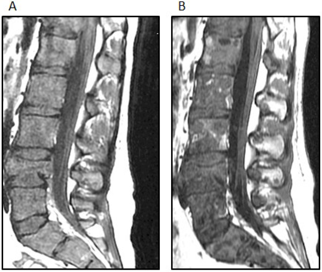 (A) The sagittal STIR (short TI inversion recovery) MRI image demonstrates extensive new osseous metastases with multiple pathologic compression fractures of the lumbar spine; (B) The sagittal T-weighted MRI image demonstrates interval mild improvement in bone marrow signal abnormality after treatment; the fatty replacement of tumor is shown by white arrows.