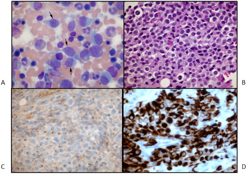 (A) Bone metastases aspirate smear. Wright-Giemsa stain; 600× magnification. The arrows point to some of the malignant cells in this field; (B) Bone metastases, high power: bone marrow biopsy. Hematoxylin and eosin stain; 400× magnification. A sheet of malignant cells at high magnification; (C) Bone metastases, synaptophysin stain: bone marrow biopsy. Immunohistochemical stain for synaptophysin; 400× magnification. A stain for synaptophysin shows peri-nuclear dot-positivity in the malignant cells; (D) Bone metastases, GFAP stain: bone marrow biopsy. Immunohistochemical stain for GFAP; 400× magnification. A stain for GFAP marks the cytoplasm of the malignant cells.