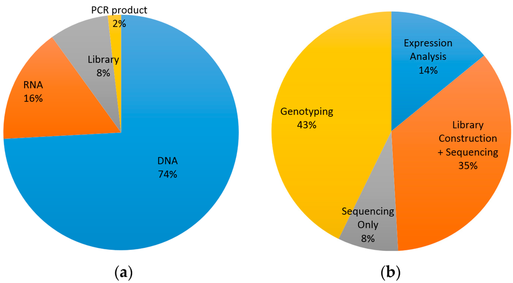Percentage distribution of samples submitted by (a) type of sample submitted and (b) processing platform; represents 11,155 samples from 75 investigators submitted over a one year period (September 2014–September 2015).