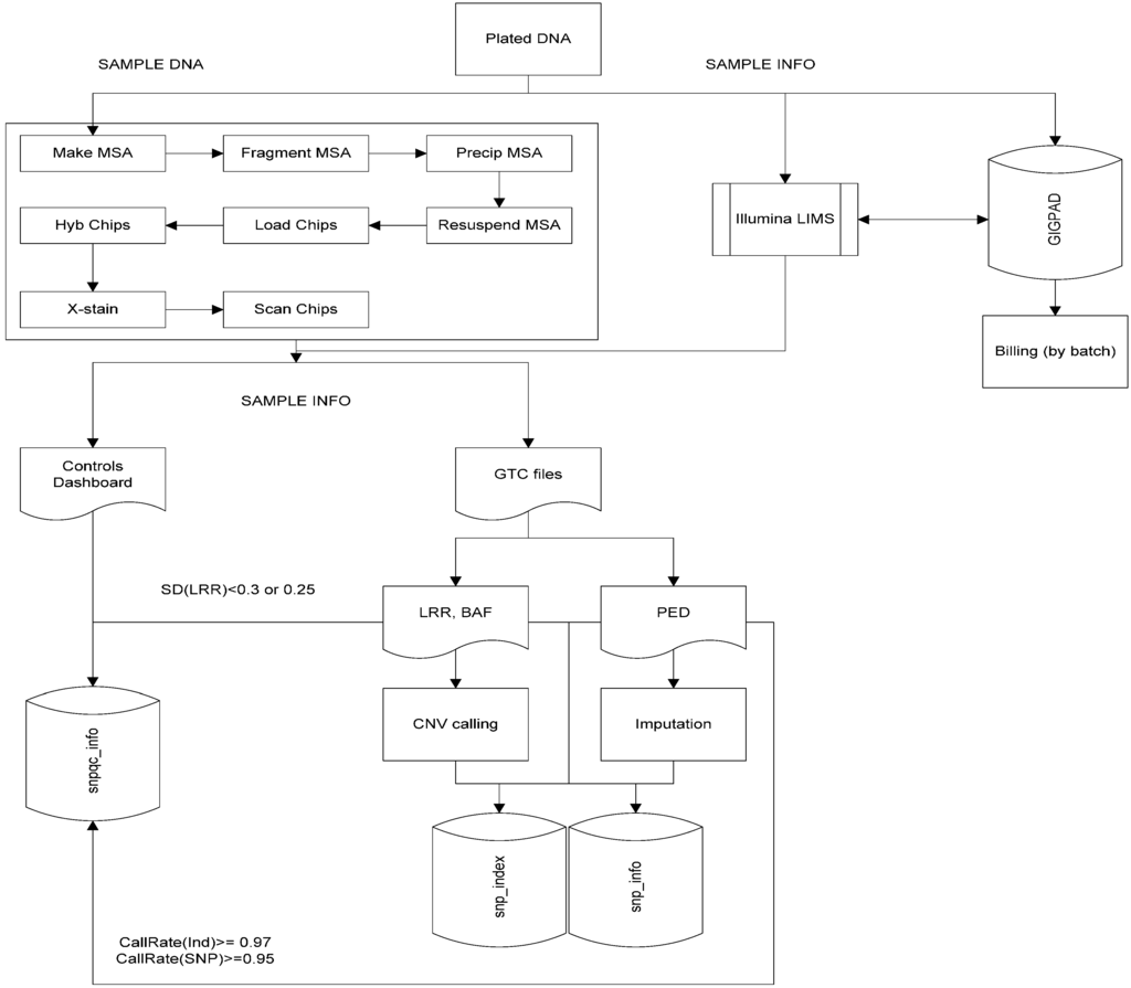 On completion of scanning the chips, data (.idat) is collected in the Illumina LIMS and a previously generated cluster file (.egt file) from Illumina GenomeStudio software is applied to it along with a SNP manifest file specific for the version of the chip used (.bpm). The cluster file assigns an allele call to each sample per SNP based upon the intensity of the fluorescent dye found at a position on the chip during scanning. The ID of the SNP is based on the position of the call on the chip using the manifest (.bpm) as a reference. This produces the genotype call files (GTC) that are used to create smaller binary PED files. PEDs from each sample are merged together and then curated to remove failing SNPs, which are SNPs having a call rate <0.95% across all samples, or SNPs that are not mapped to the genome. At this point the Biobank IDs are re-associated with the data as well as a gender designation. The genotyped gender is compared to the assigned gender as a QC check. Quality control plots are generated to allow identification of failing samples; those that are lower than 97% success across all targeted positions or show an intensity signal lower than the intensity of the background noise. An overview of the genotyping workflow is shown in Figure 3 which highlights the sample wet bench processing, integration of the Illumina LIMS and our homebrew GIGPAD LIMS, as well as initial bioinformatics analyses that offer basic genotyping calls and quality control check based on SNP intensities and/or call rates. Additional information on the bioinformatics workflow is described in Tsai et al. [1]. For the TGC, the utility of this integration between the LIMS and Biofx processes is in its ability to perform cluster file generation using multiple batches run on the same array, thereby enhancing allele calling, particularly to rare SNPs, and lower the SNP failure rate. In addition, the generation of sample QC plots for multiple batches simultaneously, which occurs at the “snpqc_info” step in Figure 3 and is described in Tsai et al. [1], allows the laboratory team to more easily identify failed samples and batch specific trends relating to sample quality or chip lot quality due to manufacturer error.