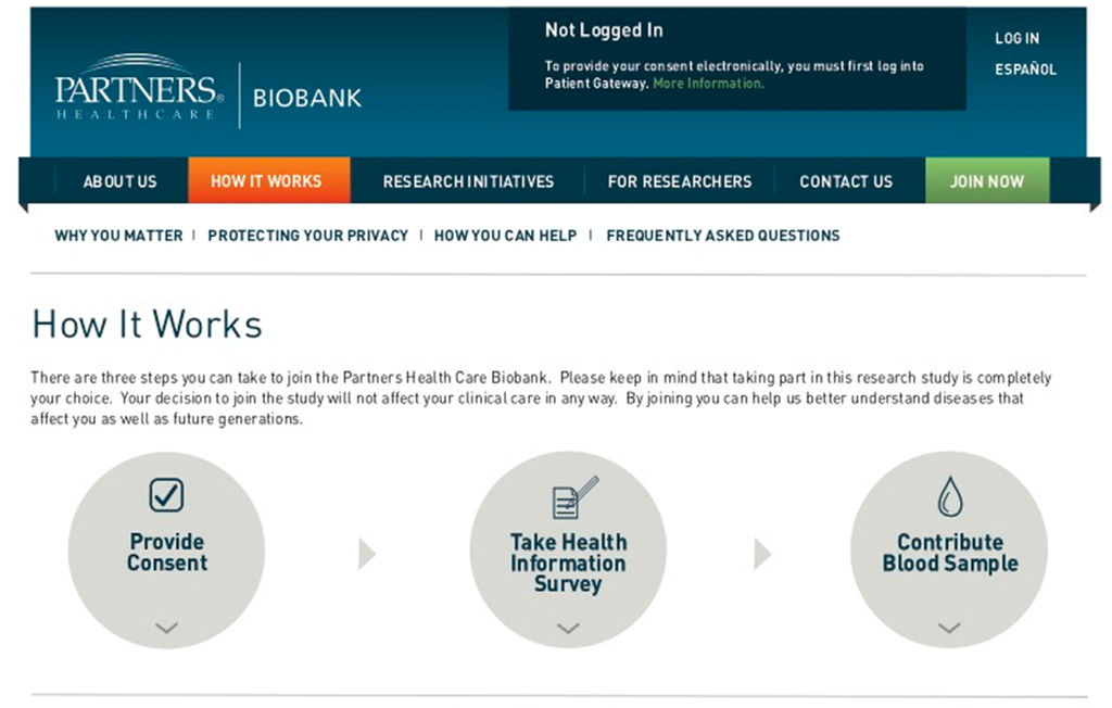 A few functional and technical requirements are essential to the success of eIC. They are identity authentication, security, user experience and marketing. Authentication refers to the process that enables the Biobank to ascertain the identity of the subject who provides consent. There are several ways to enable the unique identification of subjects. For example, it is possible to purchase the services of an identity verification service. Such services may verify identify information against authoritative sources, such as credit bureaus or other databases. At Partners HealthCare, we decided to leverage the unique user name and password that are required when patients set up accounts with the patient online portal (Patient Gateway) at Partners HealthCare. The Biobank’s ability to validate a subject’s identity with a unique user name and password was essential to the development and success of eIC.