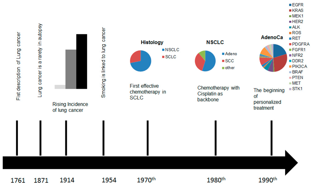 The treatment of non-small cell lung cancer (NSCLC) has dramatically changed over the last decades. Since the wide spread of array technology and next generation sequencing, several driver mutations, including gene rearrangements, have been identified, leading to a better understanding of many oncological targets and the development of new small-molecule drugs, intervening in pathways, which control growth, differentiation, and metastasis of lung cancer cells [1,2,3,4,5,6]. These findings changed the view of the oncological community on lung cancer. For the first decades of the twentieth century lung cancer was considered as a homogenous disease and a small number of patients with local tumour load were treated surgically by pneumonectomy, and later on by lobectomy. For the majority of patients with advanced disease no effective treatment was available [7]. In the 1970s lung cancer was divided into non-small cell lung cancer and small cell lung cancer (SCLC) and the first successful chemotherapies, especially in SCLC were established. In the 1980s, after screening a broad spectrum of cytotoxic agents, it became apparent that cisplatin as a backbone, combined with a second drug, improves survival and became the first-line standard of care in advanced small cell and non-small cell lung cancer [8] (Figure 1). During the following years, various immunohistochemical markers enabled pathologists to define more distinct histopathological subgroups, different therapeutic agents were developed, and their use in distinct histopathologic entities were optimized [2]. All this interdisciplinary research led to a median survival of 12, or more, months in patients with metastasising lung cancer [9,10,11,12,13]. The discovery of single mutations which could be used for cancer treatment in the beginning of the new millennium facilitated an individualized treatment even if mainly limited to non-smokers and adenocarcinomas (ACs). At the same time we learned to characterize lung carcinomas by radiological, morphological, immunohistological, and molecular changes [14]. These breakthroughs offered new treatment options and made the pathologist and the radiologist an integral part of a multidisciplinary team in lung cancer treatment.