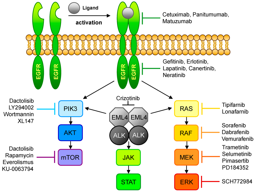 Overview of the EGFR- and ALK-signaling pathways and their respective inhibitors. Ligand binding to EGFR leads to dimerization of the receptor, resulting in phosphorylation of the tyrosine kinase domain and activation of the PIK3/AKT/mTOR or the RAS/RAF/MEK/ERK signaling pathway. This signal transduction cascade could also be activated via EML4-Alk which, in turn, may initiate the JAK/STAT pathway. The affected pathways control cell growth and play a role in cell differentiation.