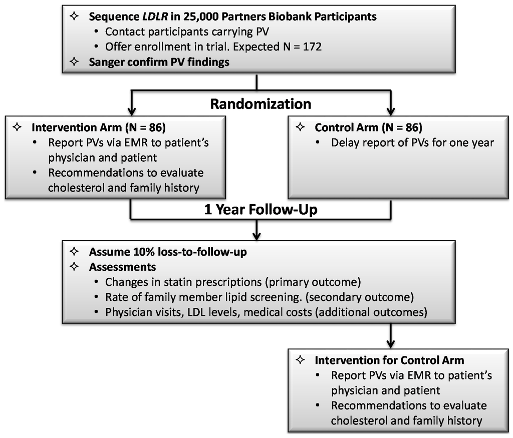 Sequencing of the three FH genes will be performed for 25,000 DNA samples in the Partners HealthCare Biobank. Non-CLIA sequencing of these genes will be followed by bioinformatics filtering to identify LoF and missense variants most likely to be associated with high LDL-C. Novel missense mutations will be evaluated for pathogenicity using multiple computational algorithms. Biobank subjects ≥18 years old with PVs will be contacted and offered enrollment in the trial. If they agree, a separate blood sample for Sanger (CLIA) confirmation of the PV will be drawn, after which they will be randomized to (1) Intervention Arm: the PV in FH genes is communicated right away in the EMR through GeneInsight; or (2) Alternative Arm: communication of the PV is delayed for one year. Outcomes will be ascertained from RPDR and from the patients through quarterly surveys and interviews. The pre-specified primary outcome will be the number of patients in whom a relevant LDL-lowering medication, i.e., statins, is started or the dosage is changed. The pre-specified secondary outcome measure will be the number of blood relatives that the patient reports have lipid levels tested and/or genetic testing as a result of the report to the patient’s physician. Additional outcomes will be LDL-C levels and number of physician visits. We will also evaluate cost-effectiveness of the intervention in terms of direct and indirect costs as well as measures of health related quality of life (e.g., QALYs).