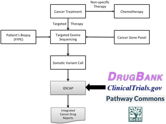 Figure 1 highlights targeted therapies among other cancer treatments and the role of our tool IDICAP, an acronym for Integrated Drug Intervention for CAncer Panel, in the proposed treatment roadmap. An effective therapy begins with an accurate portrayal of the patient’s gene mutation profile. The advance of DNA short-read sequencing technology, better known as Next Generation Sequencing (NGS), provides a powerful technology to capture the unique mutation landscape of patients. It is known that mutations of a handful of genes, namely the cancer panel genes, drive cancer development, although cancer panel genes of some cancers are better understood than the others. Additionally, a majority of deleterious somatic mutations occur in exons, resulting in aberrant proteins or complete gene knockout. Thus, channeling sequencing capacity of NGS to well-supported pathological exons and regulatory regions of cancer panel genes is a more effective approach to harness the power of NGS than sequencing all genes or the whole genome. The benefit includes higher sequencing depth and quality but at a reduced cost per base. Besides, physicians can use certain functional regions as markers to monitor the cancer progression of their patients [11]. This sequencing approach is known as targeted exome sequencing. A study in 2013 [12] that sought to test the feasibility of a targeted sequencing platform for explorations of colorectal cancer utilized a set of 183 genes that directed their project. The researchers determined this set of genes was sufficient for indicating which genes were most often mutated or regulated inappropriately in colorectal cancer.