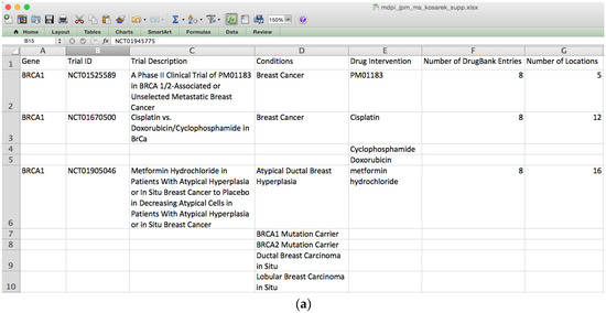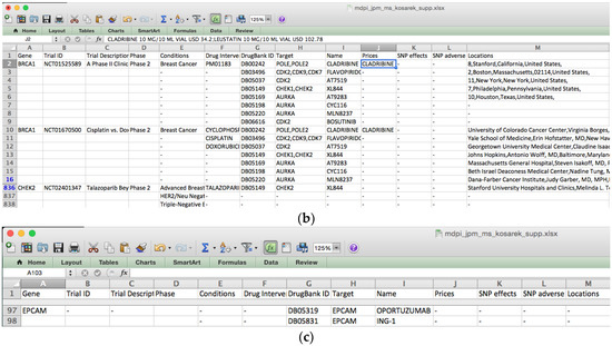 Drug reference price in USD is listed in column J in the detailed report (Figure 2b). This information is extracted from DrugBank in which the price is based on the markets in the United States and Canada [22]. The actual cost of the drugs depends heavily on the patient’s country of residence as well as his or her health insurance plan. The rationale for including the drug price is to facilitate drug cost comparison and estimation. For example, the drug gefitinib (DB00317), which targets the gene EGFR, goes by multiple trade names and dosages in the market: Tarceva (by Genetech, San Francisco, CA, USA) 25 mg tablet USD 52.78, Iressa (by AstraZeneca, London, UK) 250 mg tablet USD 68.08, Tarceva 100 mg tablet USD 144.98, and Tarceva 150 mg tablet USD 163.98. As you can see from this example, drug price varies by brand name and dosage. The benefit of IDICAP is to aggregate scattered price information into a single report that assists physicians and patients in estimating the treatment cost under different options.