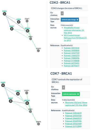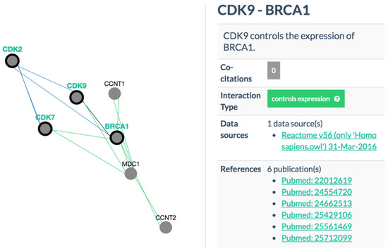 Protein-protein interactions. Screenshots taken from PCViz (Pathway Commons Network Visualizer) for interactions CDK2-BRCA1, CDK7-BRCA1, and CDK9-BRCA1 in which CDK2 controls the state of BRCA1 and CDK7/9 control the expression of BRCA1. We assume that interfering with the function of CDK2/7/9 may affect BRCA1 as well. CDK: cyclin-dependent kinase; BRCA1: breast cancer 1.