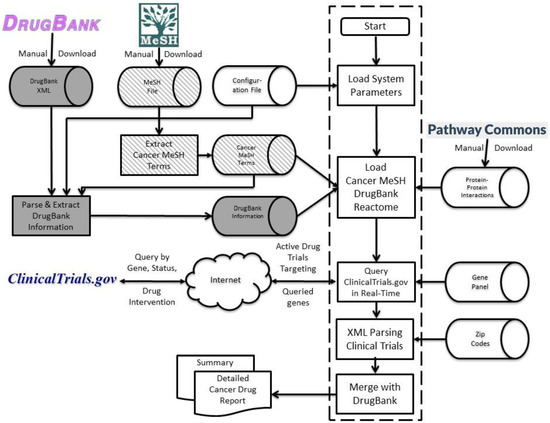 Figure 4 shows the system architecture of IDICAP in which three separate but dependent processes work together to generate cancer drug panel reports. The solid shaded components in Figure 4 represent the process of gathering drug information from DrugBank [17]. More details regarding the parsing of DrugBank information can be found in Section 4.2 below. The diagonally shaded components in Figure 4 represent the second process in which neoplasm-specific terms from Medical Subject Headings (MeSH) [16] are extracted. More details can be found in Section 4.3 below. The components inside the dashed box in Figure 4 comprise the crux of IDICAP, primarily integrating information pertaining to targeted cancer genes from ClinicalTrial.gov, DrugBank, and Pathway Commons’ PPI.