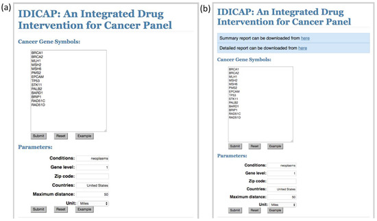 IDICAP web interface and control parameters. (a) User enters a list of human gene symbols in the cancer gene symbols box, gene symbols must be separated by at least a space, and they may span multiple lines. IDICAP will search for drugs and clinical trials that target these genes. Conditions box specifies the cancer type targeted by the clinical trials or drugs in neoplasm-specific MeSH terms. If the search involves more than one cancer type, separate the condition names by a comma (e.g., “breast cancer, ovarian cancer”). Gene level indicates the maximum level of protein-protein interaction to regress. See Section 4.6 for the details. Zip code, countries, maximum distance, and unit are parameters used by the proximity checking function. Refer to Section 4.5 for the detailed discussion. (b) Reports can be downloaded from the links displayed near the top of the web page.