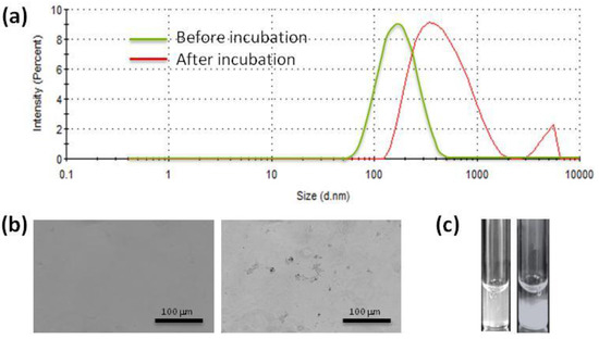 Concerning individual proteins study, albumin is the most abundant protein in the blood, so it is the first candidate to test. In parallel, fibrinogen, among others, can also be tested, since it represents a different group of proteins due to its elongated shape, as compared to the spherical 3D conformation of albumin [10,20]. When incubating nanoparticles with albumin or fibrinogen, the droplet size of nanoparticles can notably increase due to the formation of microscopic aggregates, which thus does not enable measurement by light scattering techniques (Figure 3a). However, the presence of aggregates can be confirmed under optical microscopy (see Figure 3b as an example). If the aggregation is substantial, macroscopic sediment will also appear (Figure 3c).
