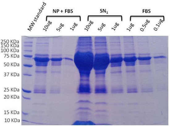 Example of a sodium dodecyl sulfate–polyacrylamide gel electrophoresis (SDS-PAGE) electrophoresis of poly-(D,L-lactide-co-glycolic acid) PLGA nanoparticles incubated with fetal bovine serum (FBS). Nanoparticle (NP) + FBS fraction correspond to those proteins strongly adsorbed onto nanoparticles surface, while the first supernatant SN1 fraction corresponds to non-adsorbed proteins. As it can be observed, the mass and amount of adsorbed proteins is lower than non-adsorbed [25].