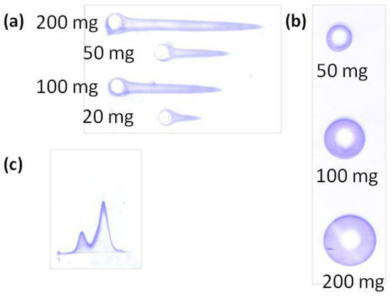 Examples of the gels obtained using described techniques. (a) Rocket immunoelectrophoresis of the free bovine serum albumin (BSA) after being incubated with polymeric nanoparticles at increasing concentrations. (b) Radial immunodiffusion of BSA after being incubated with polymeric nanoparticles at increasing concentrations. (c) 2D-immunoelectrophoresis of the C3 proteins after being incubated with polymeric nanoparticles (Adapted from [30]).