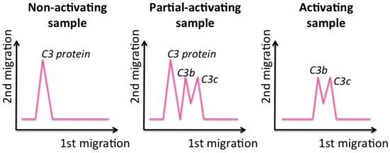 To study the complement system activation, C3 protein is the best choice, since it is a key protein and the major protein of the complement cascade [32,33,39]. It has to be incubated with the samples to test. After incubation, samples are loaded into the well of the gel and migrate through the two dimensions. If the C3 protein is not activated, which means that nanomaterials do not influence the complement cascade, a single peak, at slow migrations in the first dimension, is obtained, corresponding to the entire C3 protein (Figure 6, left). In contrast, if a sample activates the C3 protein, it breaks into fragments that, since they are smaller, migrate longer in the first dimension and are detected as two peaks (Figure 6, right) [33].
